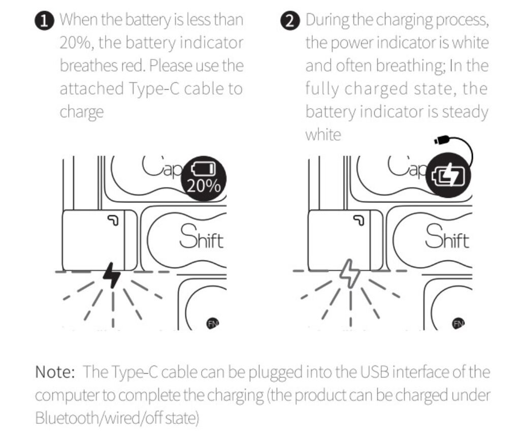 Charging is done through a USB-C port, and the keyboard can be recharged whether it’s in Bluetooth, wired, or powered-off mode. A full charge takes around five hours, which matches the battery size. While charging, the indicator pulses white and changes to a steady glow once complete, making it easy to check progress at a glance.