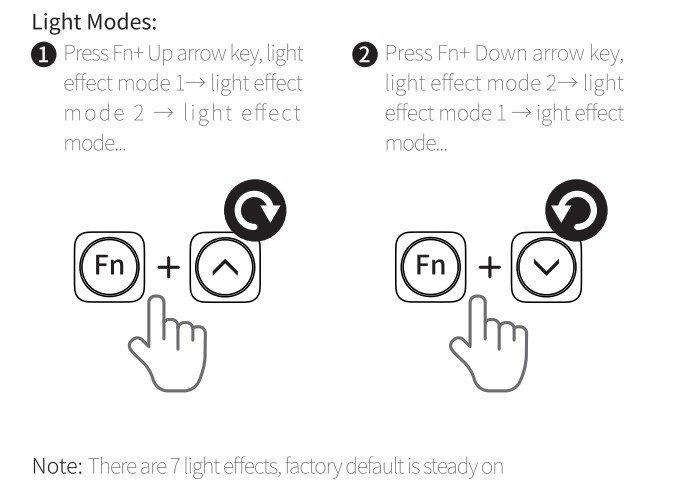 The keyboard features a simple lighting system that can be controlled directly from the keys, without the need for additional software. Users can cycle through seven lighting modes using Fn + Up or Fn + Down, with a steady-on effect active by default. Brightness is adjustable through Fn + F5 and Fn + F6, offering four levels from off to full intensity, making it easy to adapt to both bright and low-light environments.