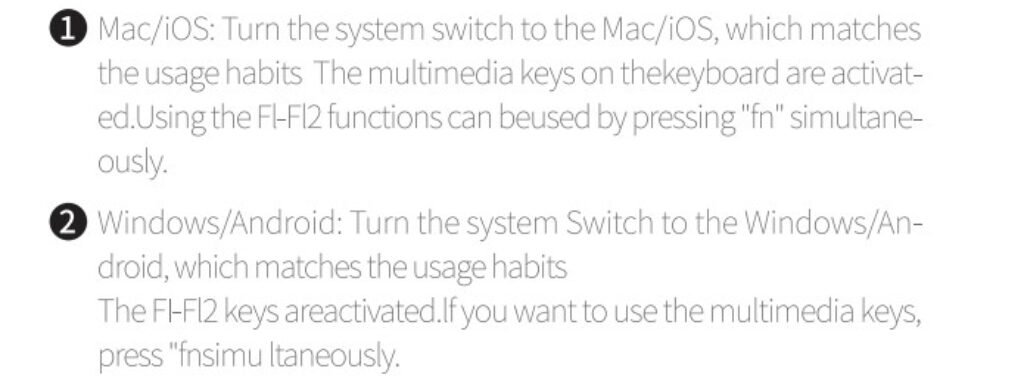 The keyboard features a dedicated system toggle that allows quick switching between Mac/iOS and Windows/Android layouts, making it suitable for multi-device setups. When set to Mac/iOS mode, media controls are prioritized on the top row, while standard F1–F12 commands remain accessible through the Fn modifier.