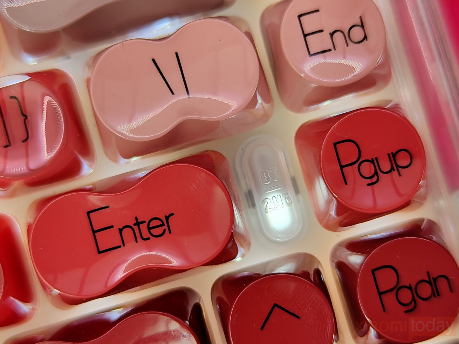 A defining detail is the lipstick-shaped ESC key positioned at the top corner. Near the arrow keys, a small BT / 2.4G indicator window provides connection status feedback. The soft lighting integrates smoothly with the translucent housing and remains subtle during operation.
