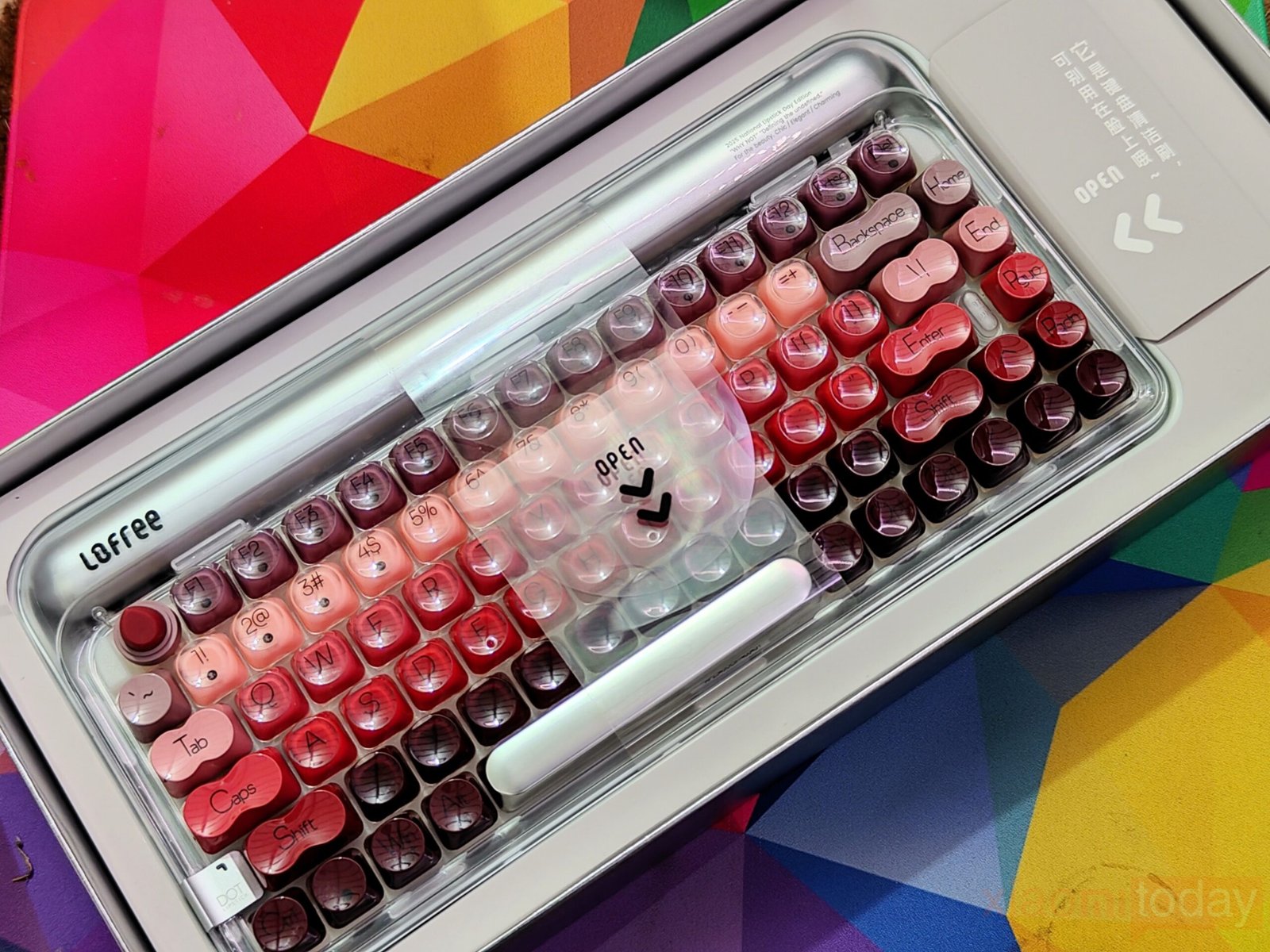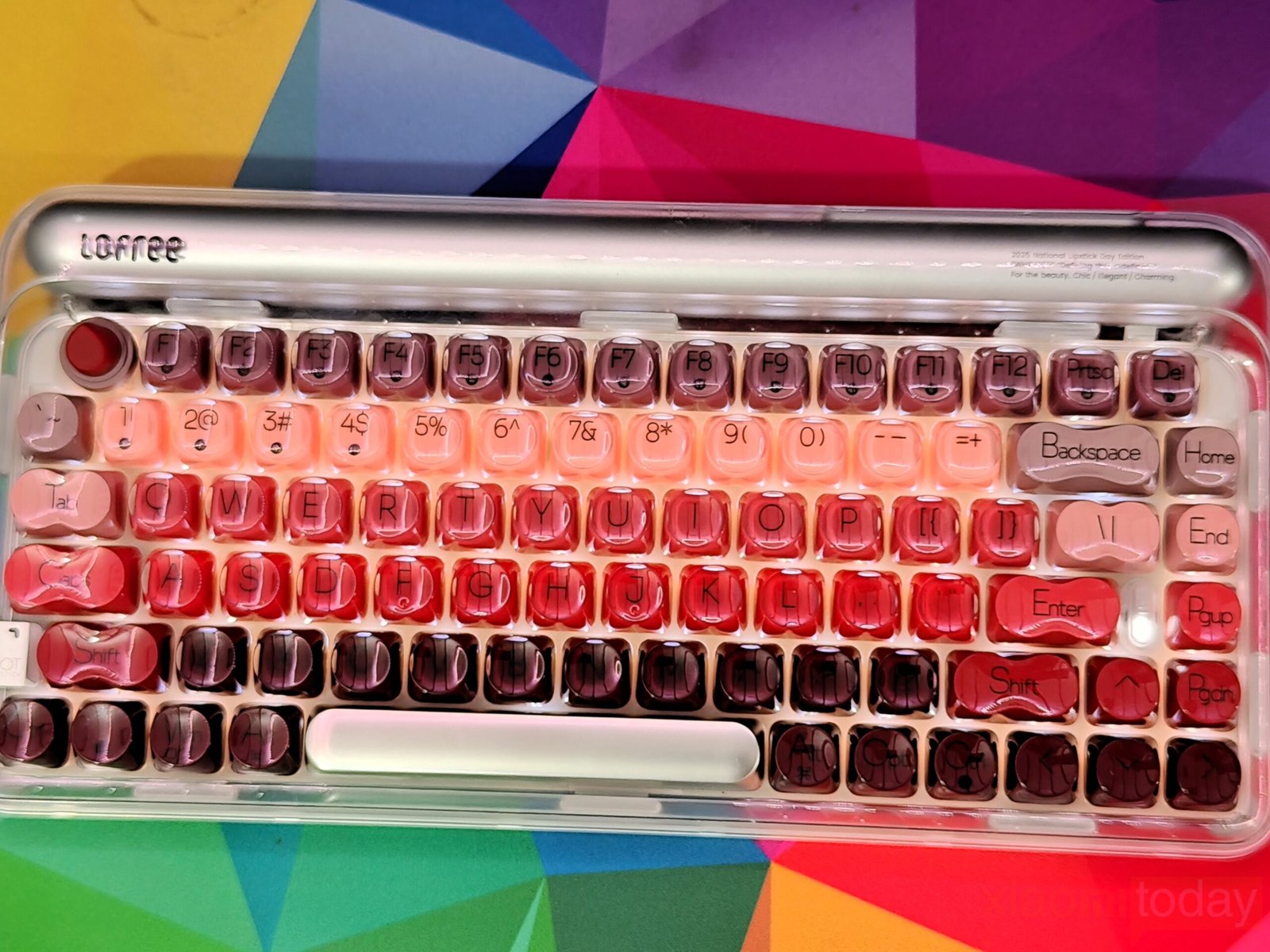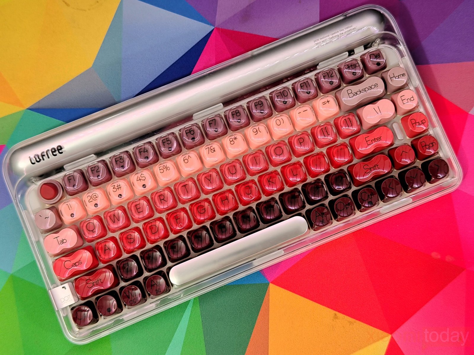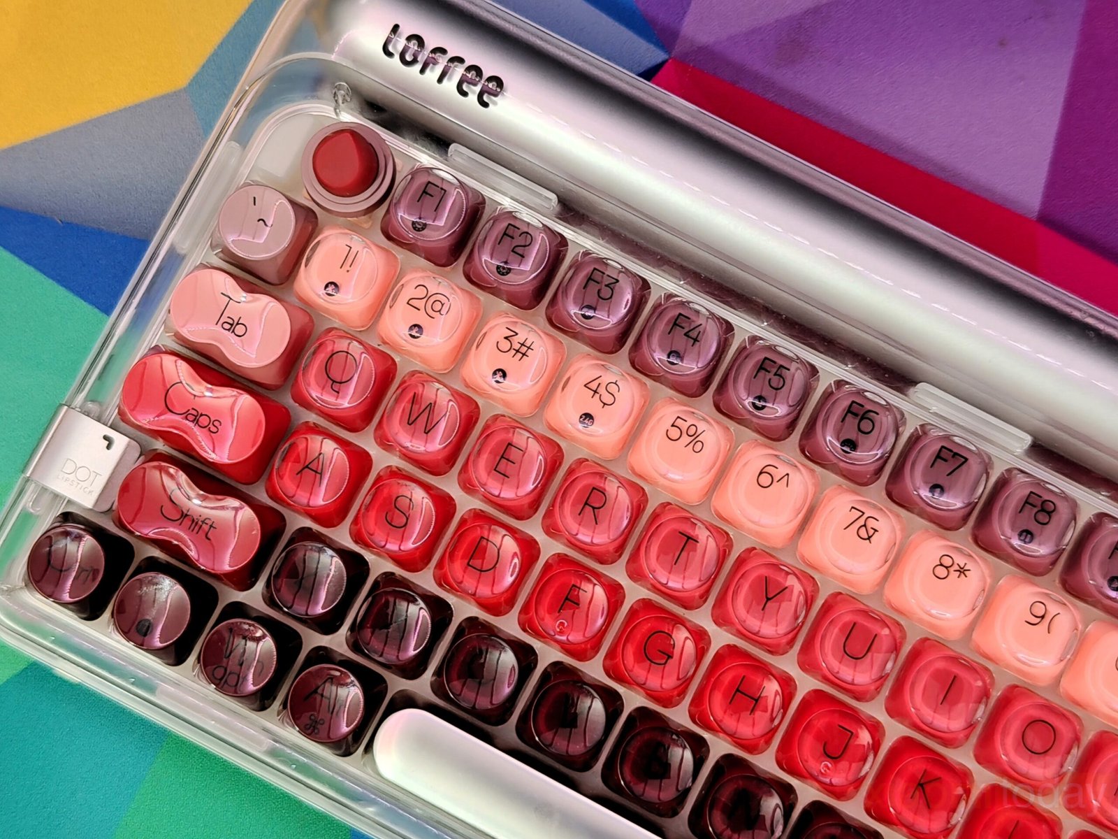 The lipstick-inspired keycap set defines the overall look of this keyboard. Lofree takes inspiration from iconic lipstick shades and blends eight vibrant hues across the layout, moving from soft peach tones to richer reds and deeper accents. The gradient flows smoothly from one section to another, keeping the overall look consistent. Each keycap uses rounded edges that echo the curves of cosmetic packaging, reinforcing the theme without affecting usability.