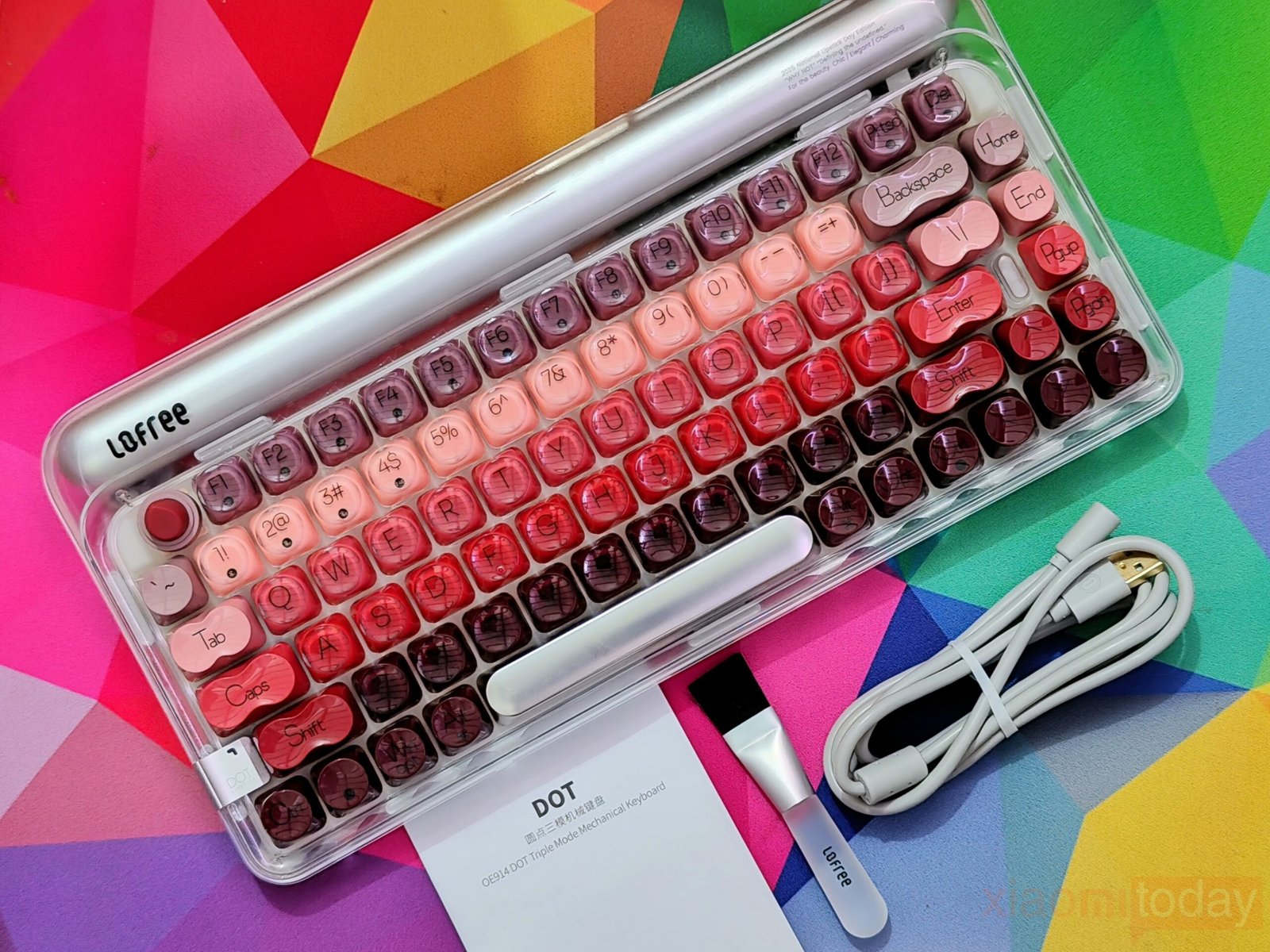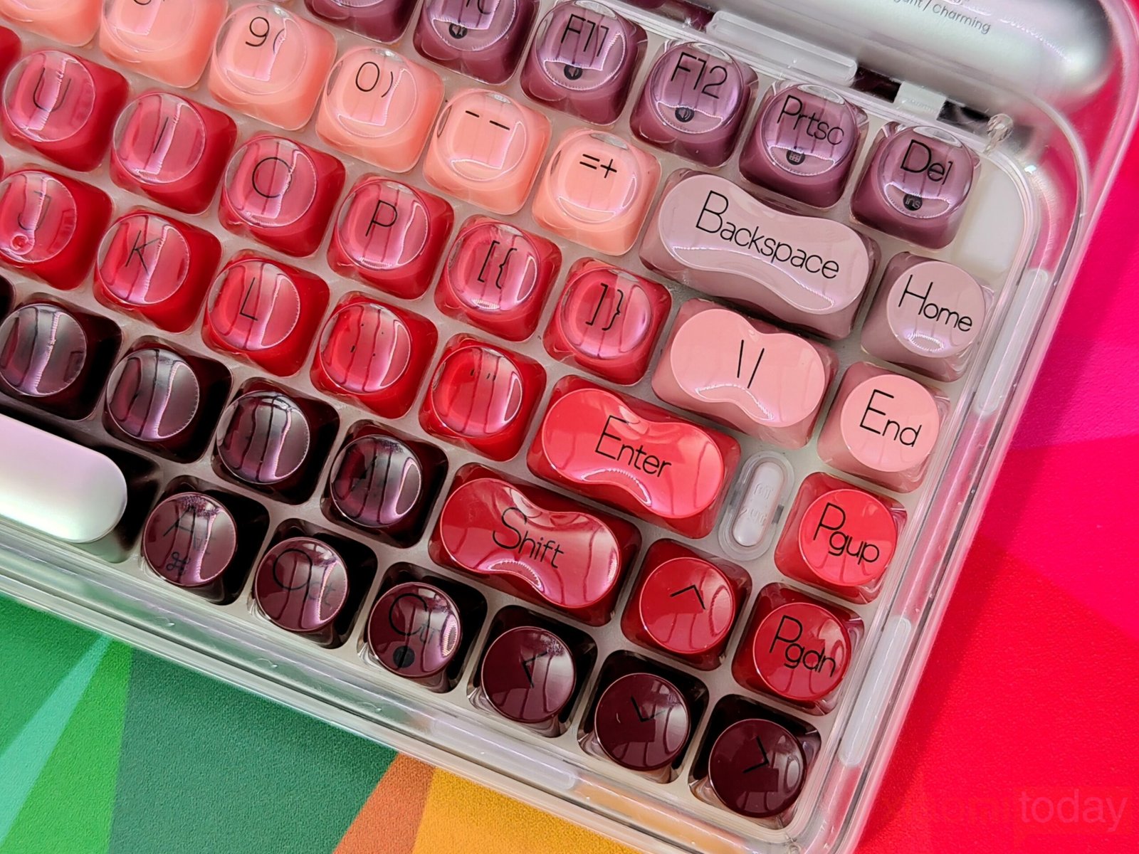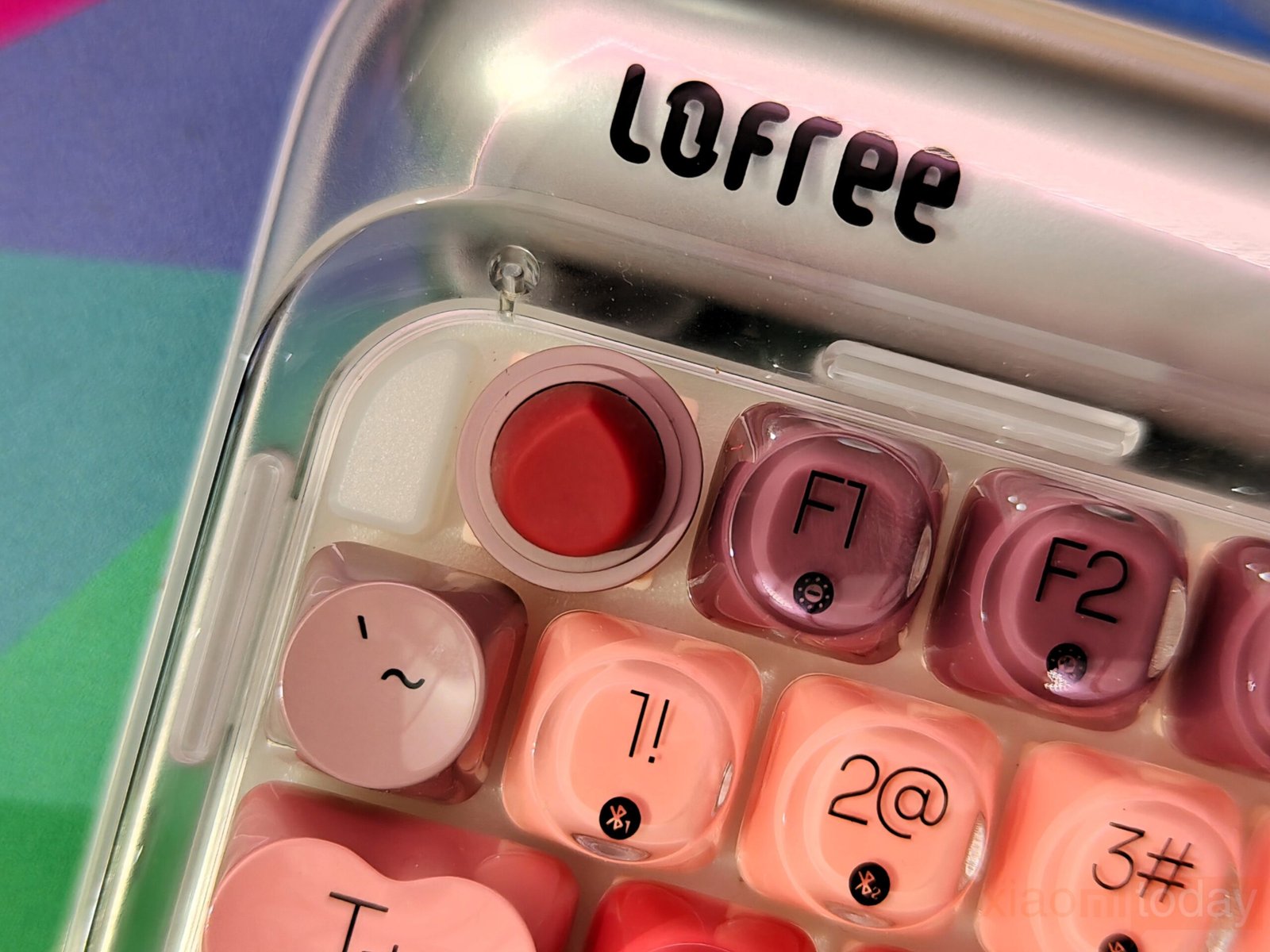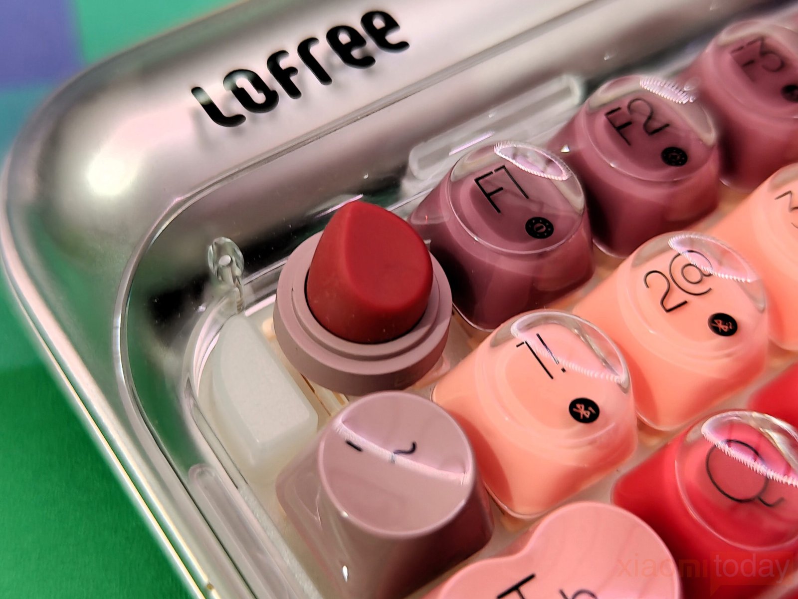 The lipstick-inspired keycap set defines the overall look of this keyboard. Lofree takes inspiration from iconic lipstick shades and blends eight vibrant hues across the layout, moving from soft peach tones to richer reds and deeper accents. The gradient flows smoothly from one section to another, keeping the overall look consistent. Each keycap uses rounded edges that echo the curves of cosmetic packaging, reinforcing the theme without affecting usability.