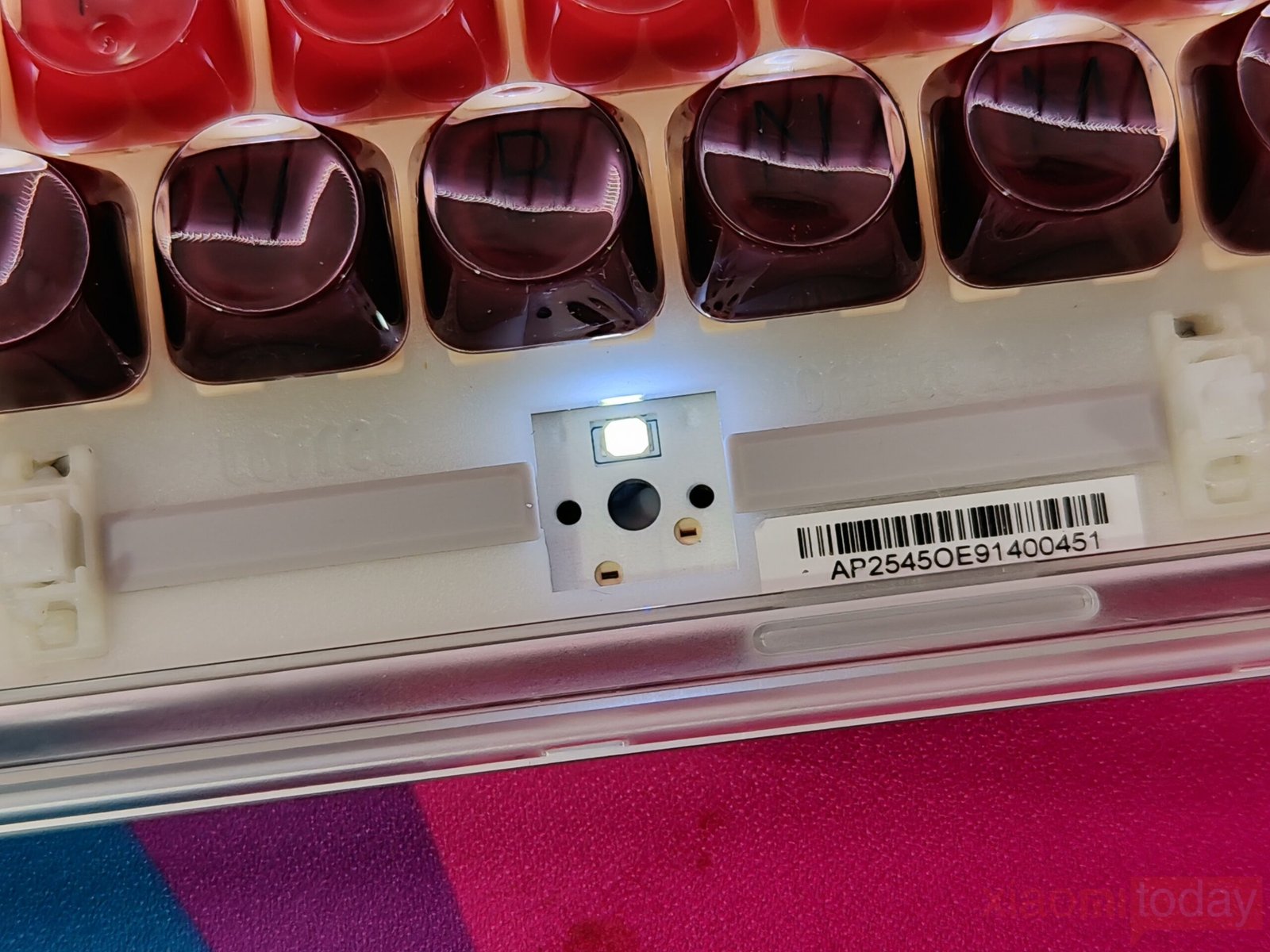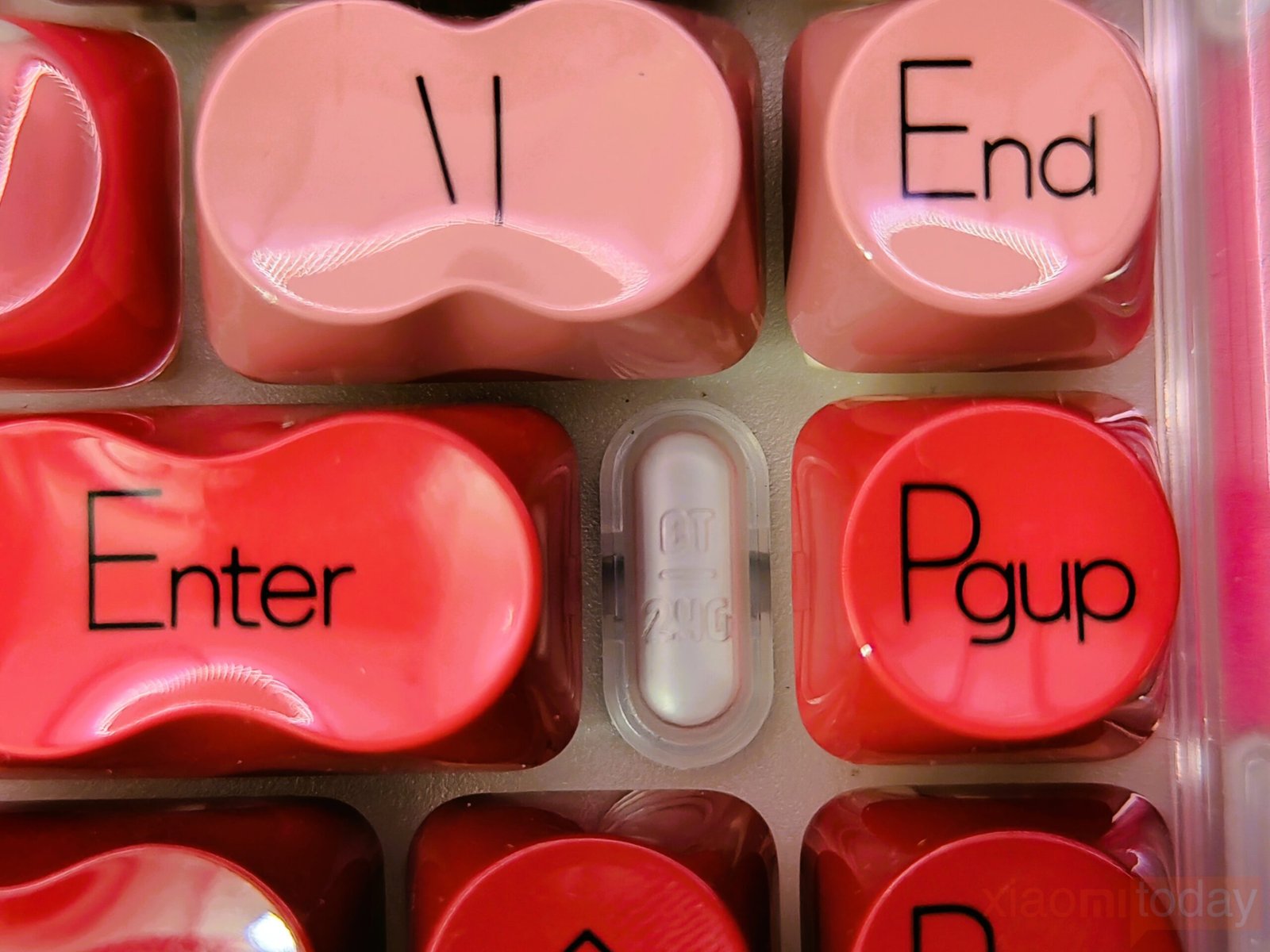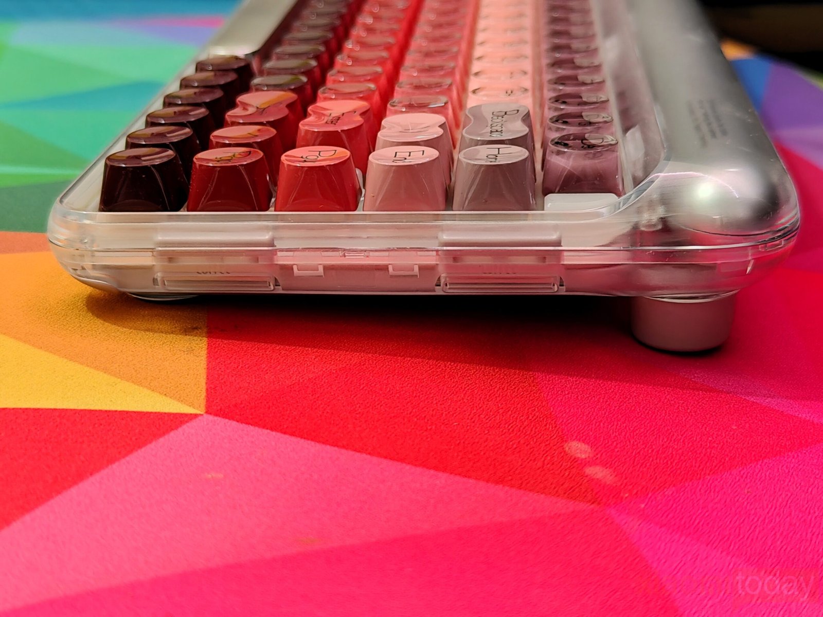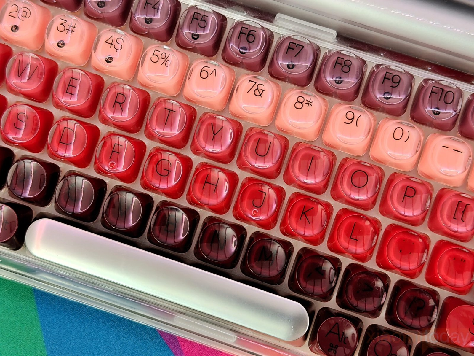 The lipstick-inspired keycap set defines the overall look of this keyboard. Lofree takes inspiration from iconic lipstick shades and blends eight vibrant hues across the layout, moving from soft peach tones to richer reds and deeper accents. The gradient flows smoothly from one section to another, keeping the overall look consistent. Each keycap uses rounded edges that echo the curves of cosmetic packaging, reinforcing the theme without affecting usability.