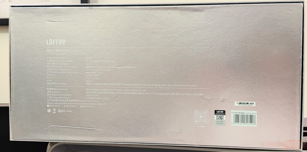 The front of the Lofree Lipstick Keyboard box takes a clean and minimal approach, featuring a soft metallic finish with the Lofree logo centered neatly. There are no flashy graphics or heavy branding, giving the packaging a refined, lifestyle-focused look rather than a gaming-oriented one. On the back, it lists important details such as the OE914 model number, materials, input power, battery specifications, and compatibility with macOS, Windows, iOS, and Android devices. The information is presented clearly, making it easy for users to understand the product at a glance.