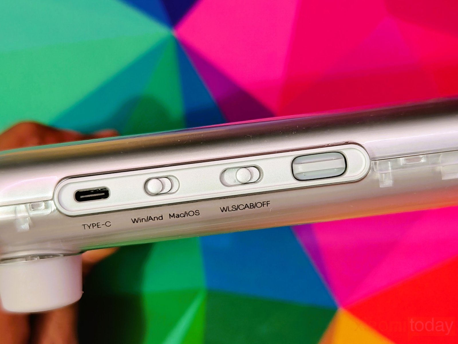 Around the frame, the layout stays functional and clean. A USB Type-C port supports wired connectivity and charging, while dedicated switches for operating system selection and wireless mode control are neatly integrated along the side.