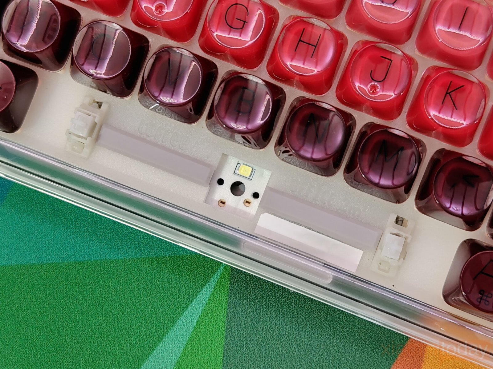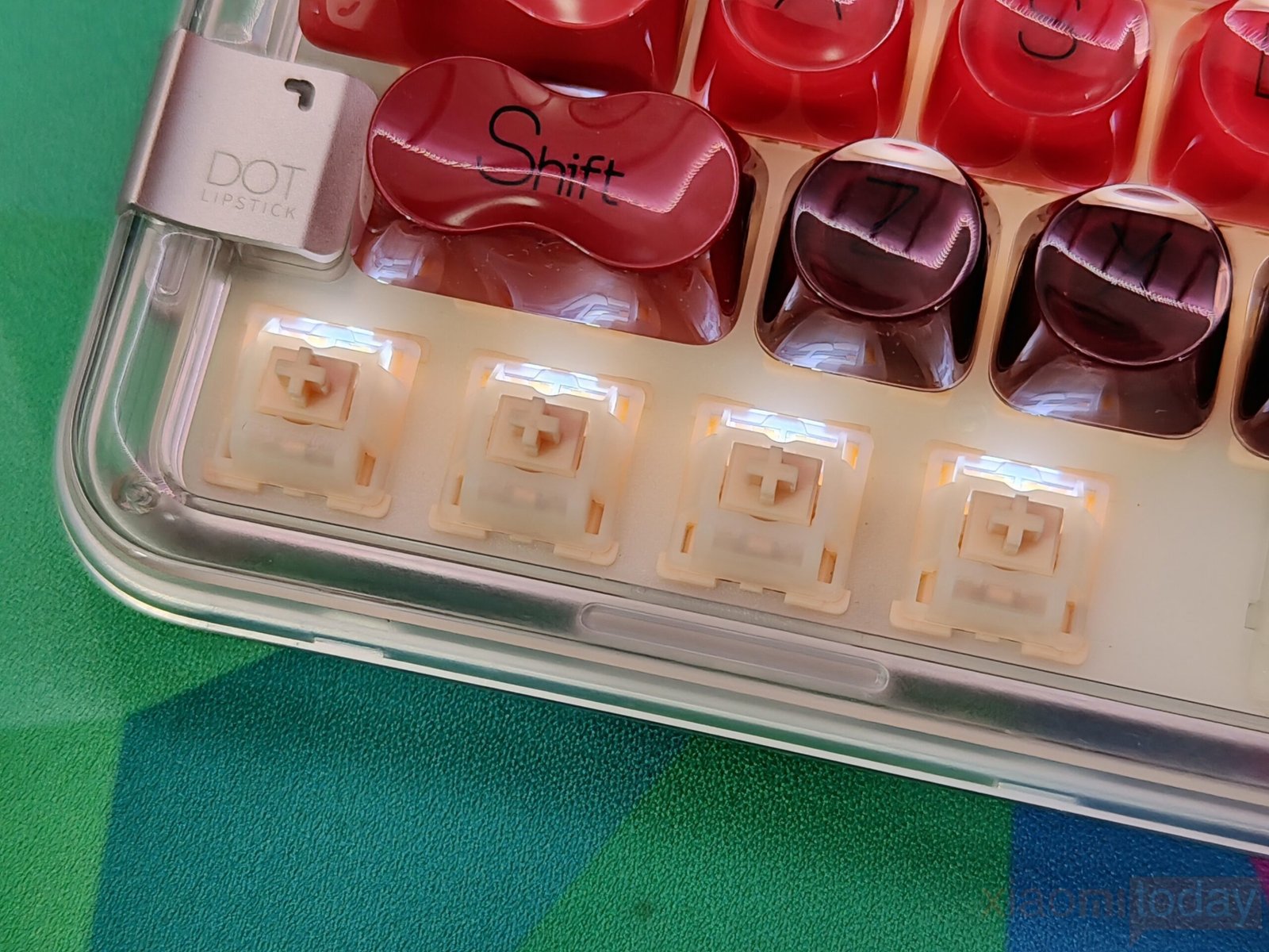 The Lofree Lipstick mechanical keyboard is built around a strong visual concept, but the design is more than color selection. Inspired by classic lipstick shades, it is available in eight vibrant finishes that allow users to coordinate their setup with a specific mood or theme. The frosted transparent housing gives the keyboard a clean, display-like appearance. Instead of using a fully clear shell, Lofree opts for a semi-transparent ABS frame that diffuses reflections while keeping the internal structure and colorful keycaps visible. This creates a layered effect that feels lifestyle-oriented without compromising usability.