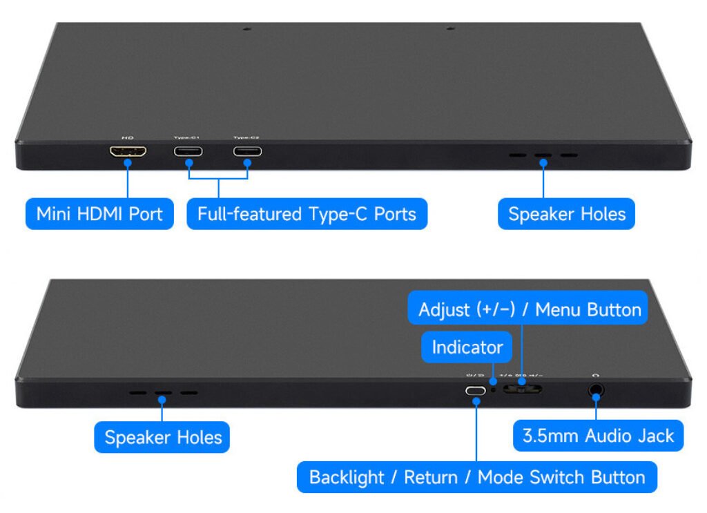 Luckfox has integrated optical bonding to reduce internal reflections and improve contrast perception. The screen supports 10-point capacitive touch through a layer of toughened glass, allowing it to function as both a display and an interactive surface. Connectivity options include Mini HDMI and USB Type-C for display input, along with a dedicated USB interface for touch data. The monitor also features built-in Hi-Fi speakers and a 3.5 mm audio jack for external audio devices.