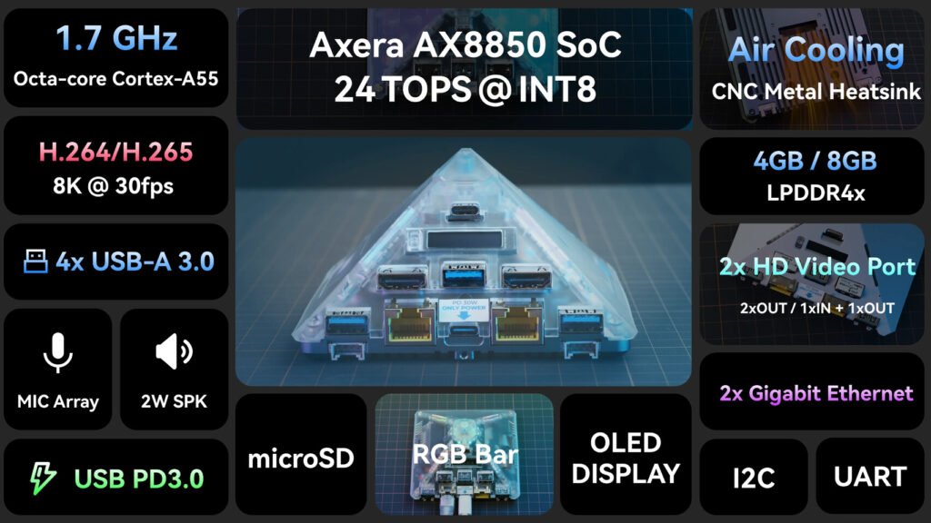 The Axera AX8850 integrates an octa-core Arm Cortex-A55 CPU clocked at up to 1.7 GHz alongside a 24 TOPS INT8 neural processing unit. This configuration enables real-time inference for deep learning models while maintaining a compact system footprint. The chip also supports hardware-based H.264 and H.265 video encoding and decoding at resolutions up to 8K at 30 frames per second. In addition, it can handle up to 16 simultaneous 1080p decode streams, positioning the device for video analytics and multi-camera processing environments.