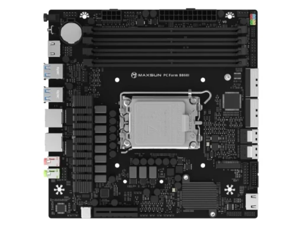 The PC Farm series is built around the ITX form factor but introduces a different internal layout. On these boards, the processor socket and memory slots are rotated by 90 degrees compared to common ITX designs. MAXSUN stated that this structure improves airflow inside the system, helping heat move more efficiently through the chassis. Based on internal testing, the company reported a temperature drop of around 10 degrees Celsius and an increase of up to 0.4GHz in operating frequency when using an Intel Core i5-14600K, compared with traditional ITX layouts.