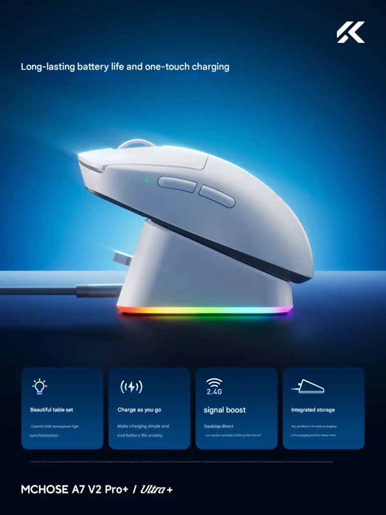 MCHOSE has released the A7 V2 Pro+ and A7 V2 Ultra+, two upgraded models in its mid-size wireless mouse lineup. These versions follow the A7 V2 Pro and Ultra, introducing practical updates aimed at improving ease of use and click consistency.