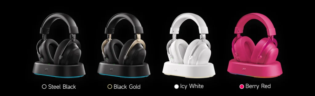 Charging and storage are handled through a magnetic wireless charging dock that comes bundled with the headset. The dock features RGB lighting and allows the headphones to be charged without plugging in a cable directly. This setup is designed to make desk placement and charging more convenient for daily use.