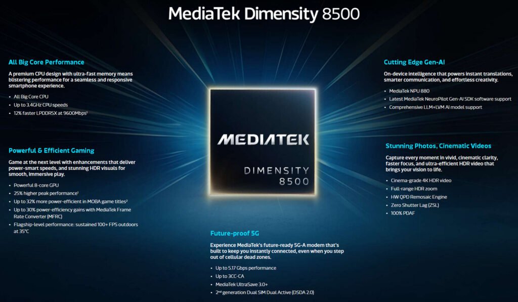 The Dimensity 8500 is manufactured on a 4 nm process and also adopts an all-big-core CPU design. It features eight Cortex-A725 cores with clock speeds reaching 3.4 GHz. MediaTek states that this setup improves both performance and efficiency for everyday use, multitasking, and gaming.