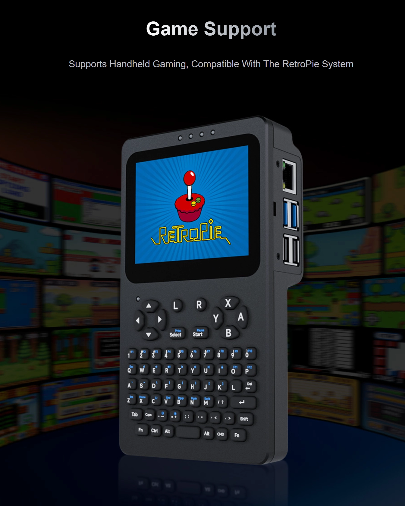 Unlike some compact handheld designs that rely on compute modules, this device does not use a Raspberry Pi Compute Module. As a result, the motherboard is not fully integrated into the main body, leaving a raised section behind the display. This design choice prioritizes accessibility and flexibility but compromises the device’s overall slim profile.