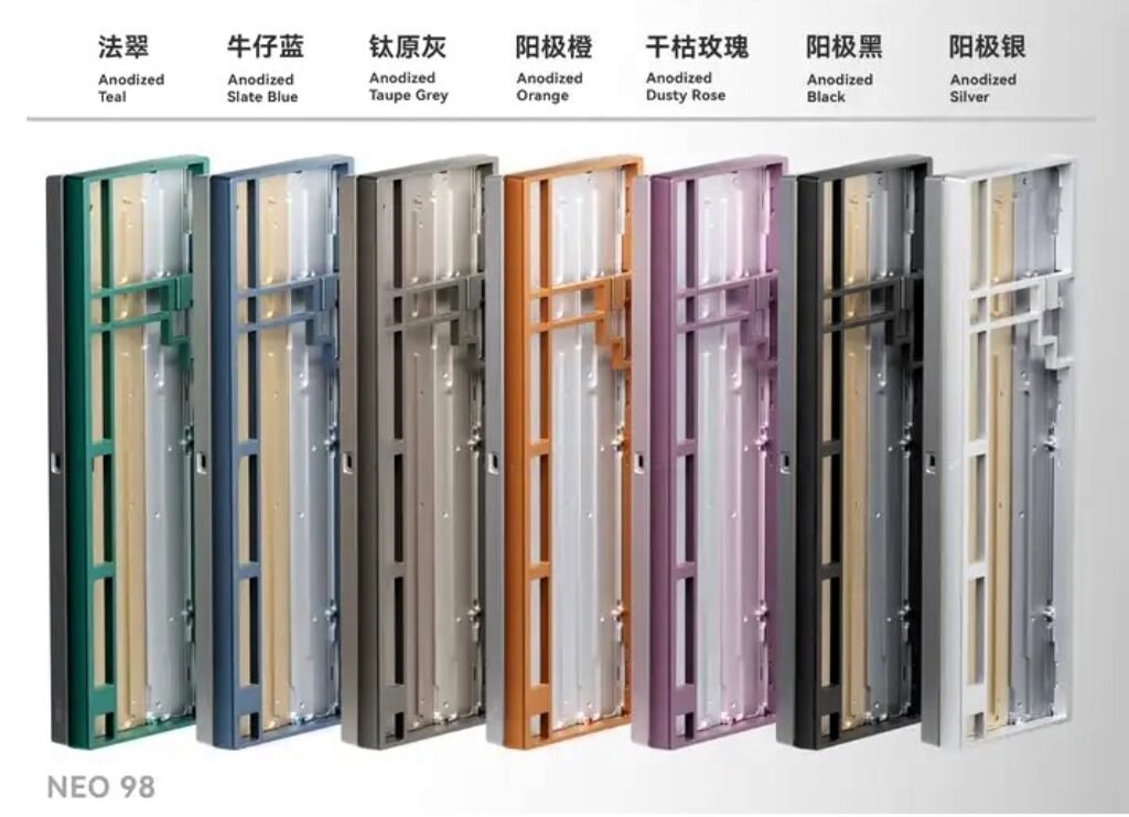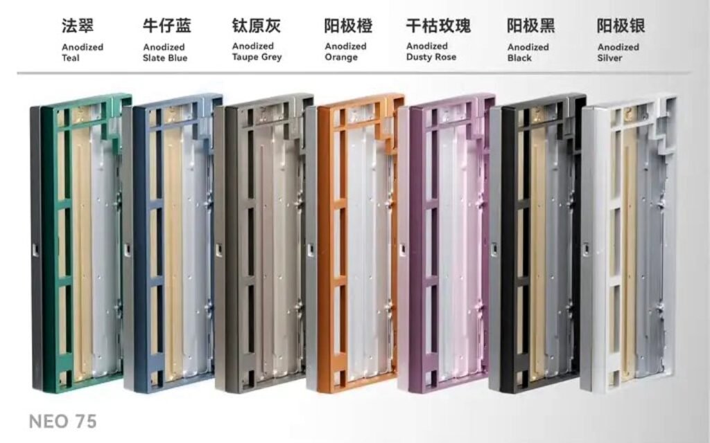 Both the Neo98 and Neo75 share a common construction approach. Each model features a full-aluminium case, an acoustic chamber integrated into the bottom housing, and a complete set of sound-dampening materials. These include plate foam, poron case foam, and an IXPE switch sheet, all aimed at improving the typing sound profile out of the box.