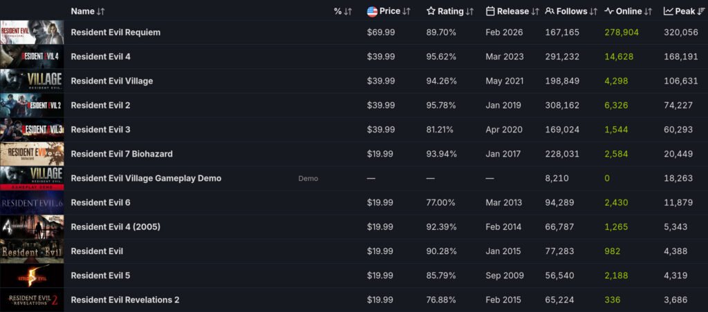 Capcom’s latest survival horror release, Resident Evil Requiem, has opened to a massive debut on PC, quickly rising to the top of Steam’s global top-sellers chart and setting a new record for the franchise. The game reached a launch-day peak of 320,056 concurrent players on Steam, marking the highest player count ever recorded for a Resident Evil title on the platform.