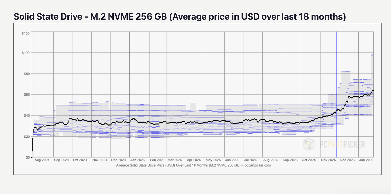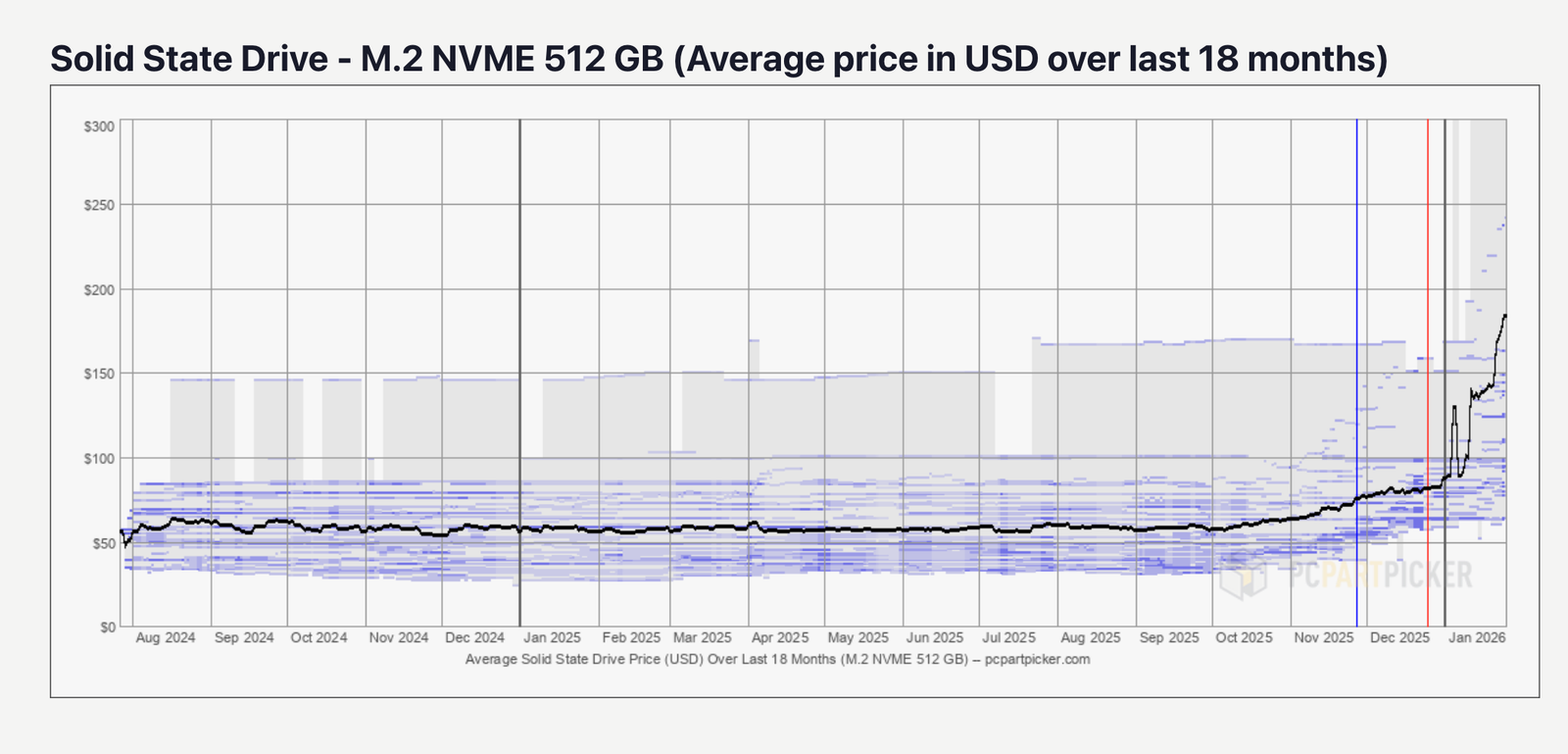 For consumers, the impact is expected to be felt most clearly in SSD pricing. Retail SSD prices have already been moving upward over the past few months. Data from PCPartPicker shows that average SSD prices have increased by around 18% since October 2025. With NAND contract prices reportedly doubling, further increases at retail appear likely.