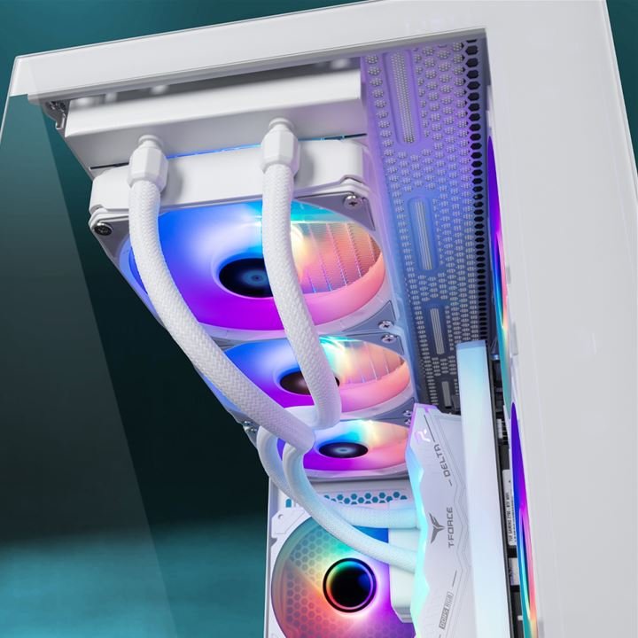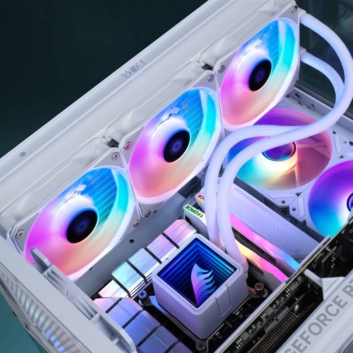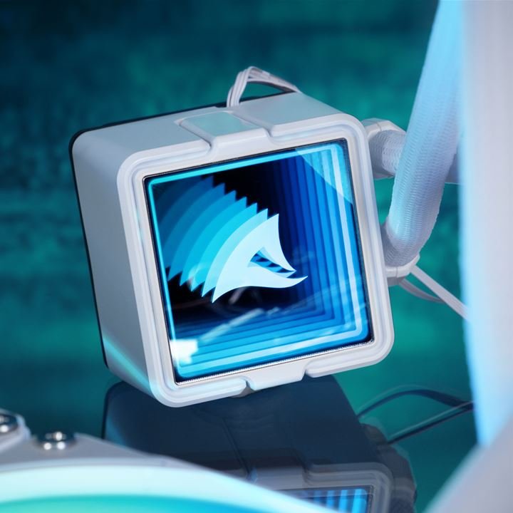 The pump unit features a square design with an integrated infinity mirror effect, adding a layered lighting appearance that fits into RGB-focused builds. Combined with the ARGB lighting on the fans, the cooler is intended for systems where internal visibility plays a role in overall design, especially in cases with tempered glass panels.