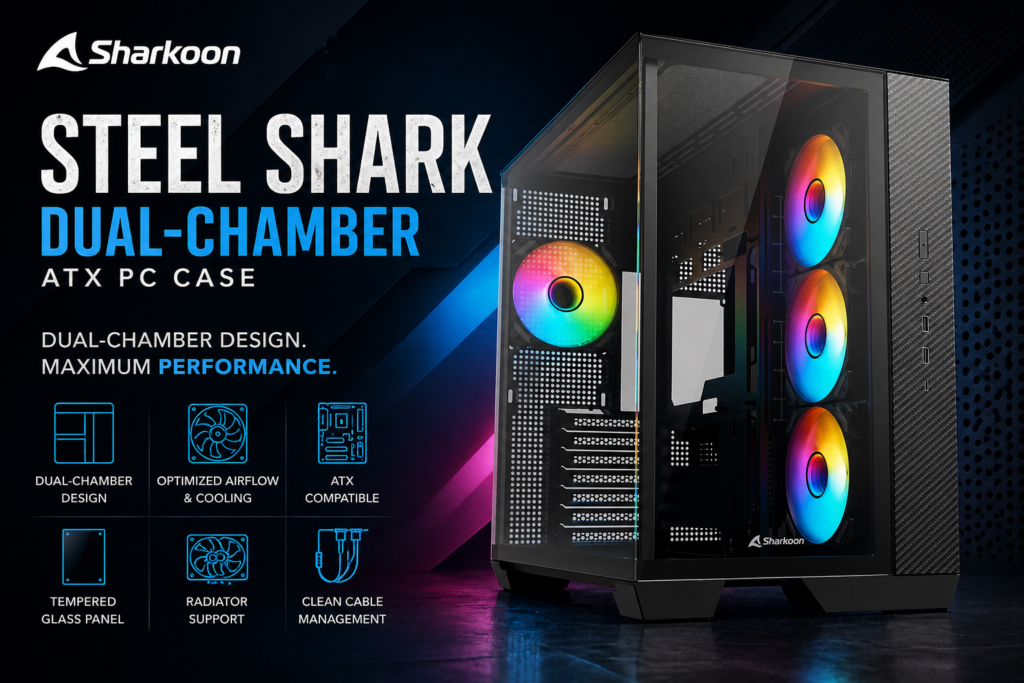 Sharkoon has introduced the Steel Shark, a new ATX mid-tower chassis designed for users who prefer a clean internal layout with support for modern hardware. The case follows a dual-chamber structure, separating the primary components from the power supply and cable routing area, helping reduce clutter inside the main compartment.