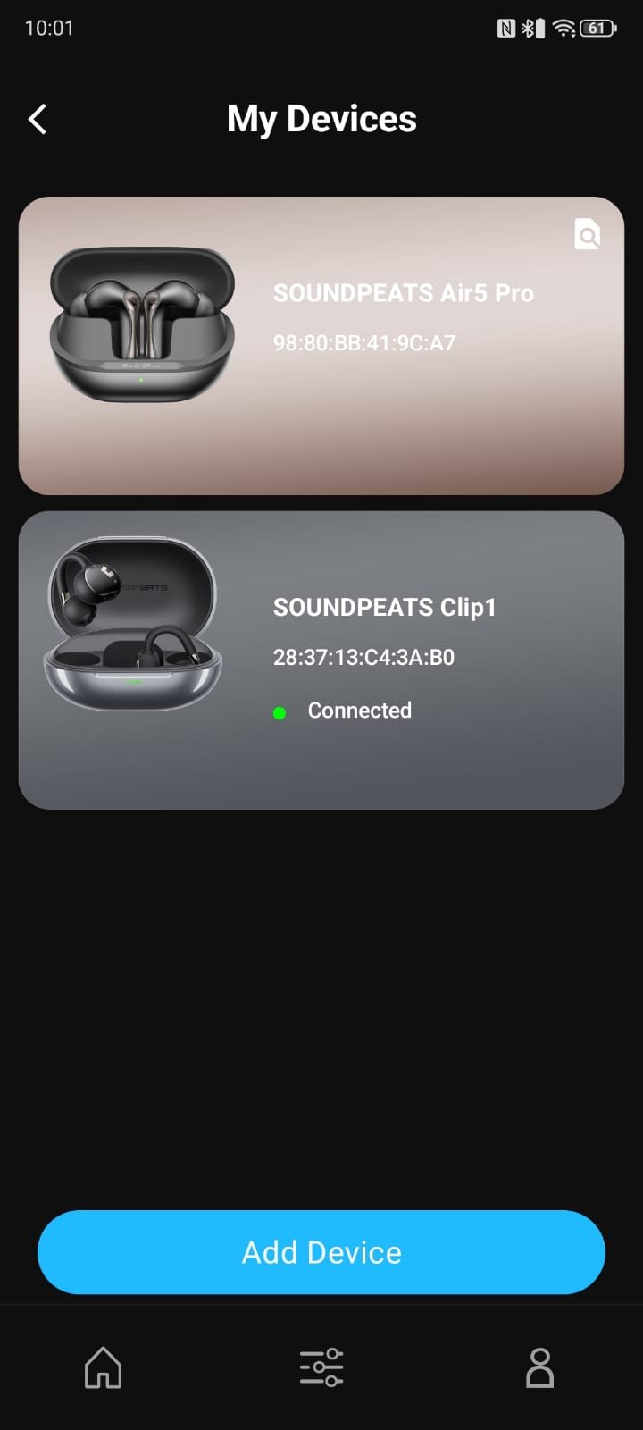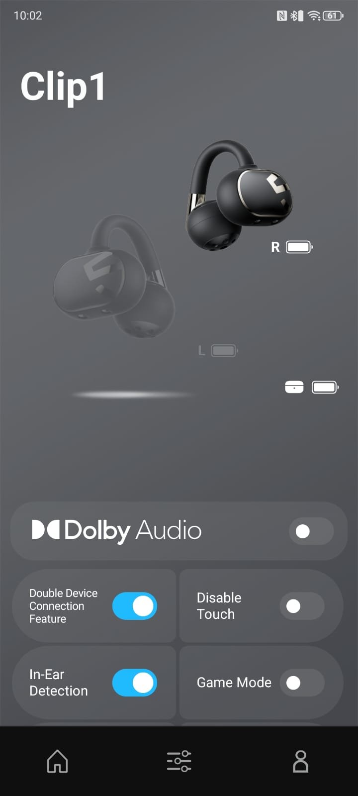 The PeatsAudio app works as a companion for SOUNDPEATS earbuds. On launch, it gives a clear view of connected devices, showing battery levels and connection status at a glance. Selecting a device, like the Clip1, brings up essential controls such as Dolby Audio for spatial sound, Multi Device Connection for easy switching, and In-Ear Detection to manage playback automatically. The interface keeps everything accessible on one screen, making adjustments quick and convenient.