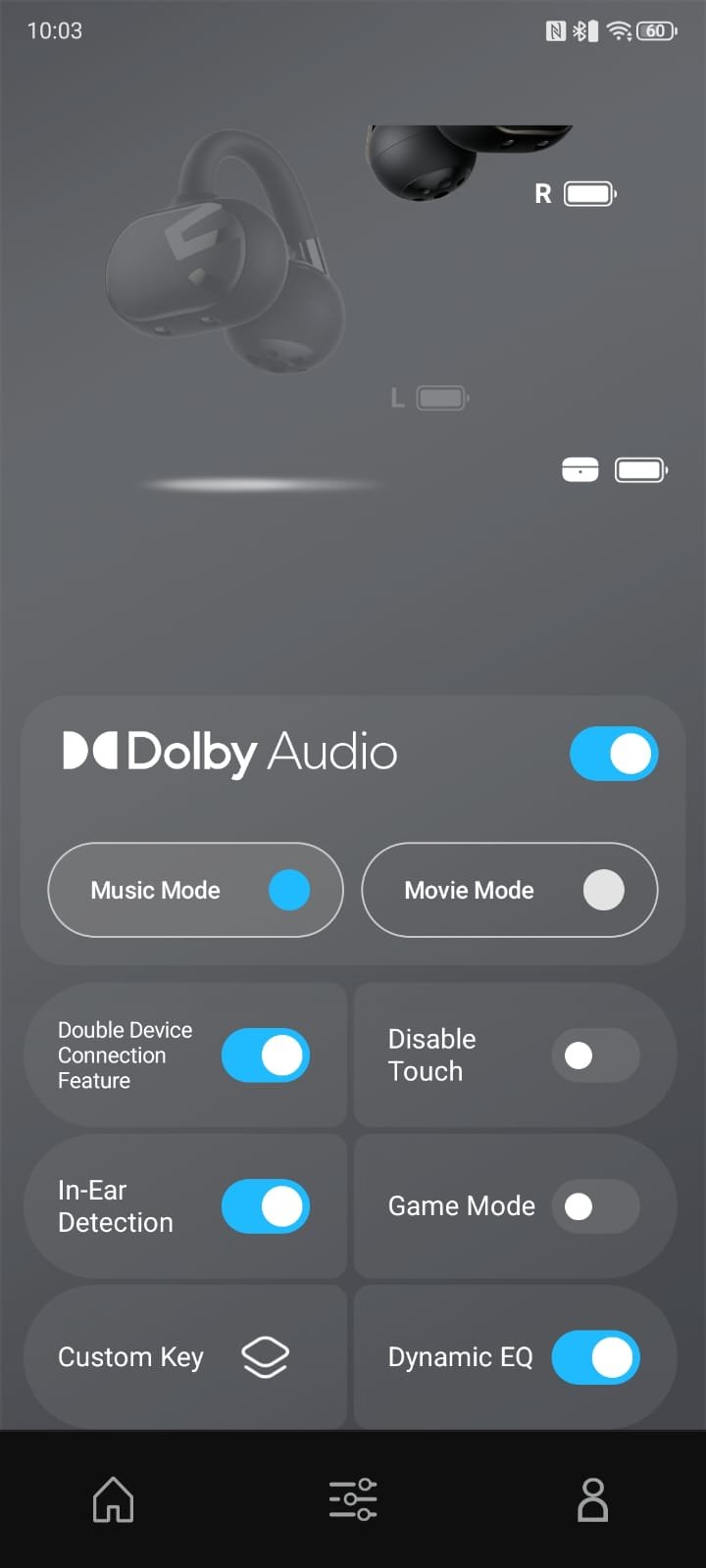 Touch controls handle all the basic actions, making it easy to manage playback, calls, and sound modes without touching your device. Single-tap gestures are fully customizable through the companion app. You can switch tracks, activate game mode, toggle Dolby spatial sound, or turn on wear detection. Tapping functions only work while the earbuds are being worn, preventing accidental commands. The touch system feels responsive and gives enough flexibility for everyday use or gaming sessions.