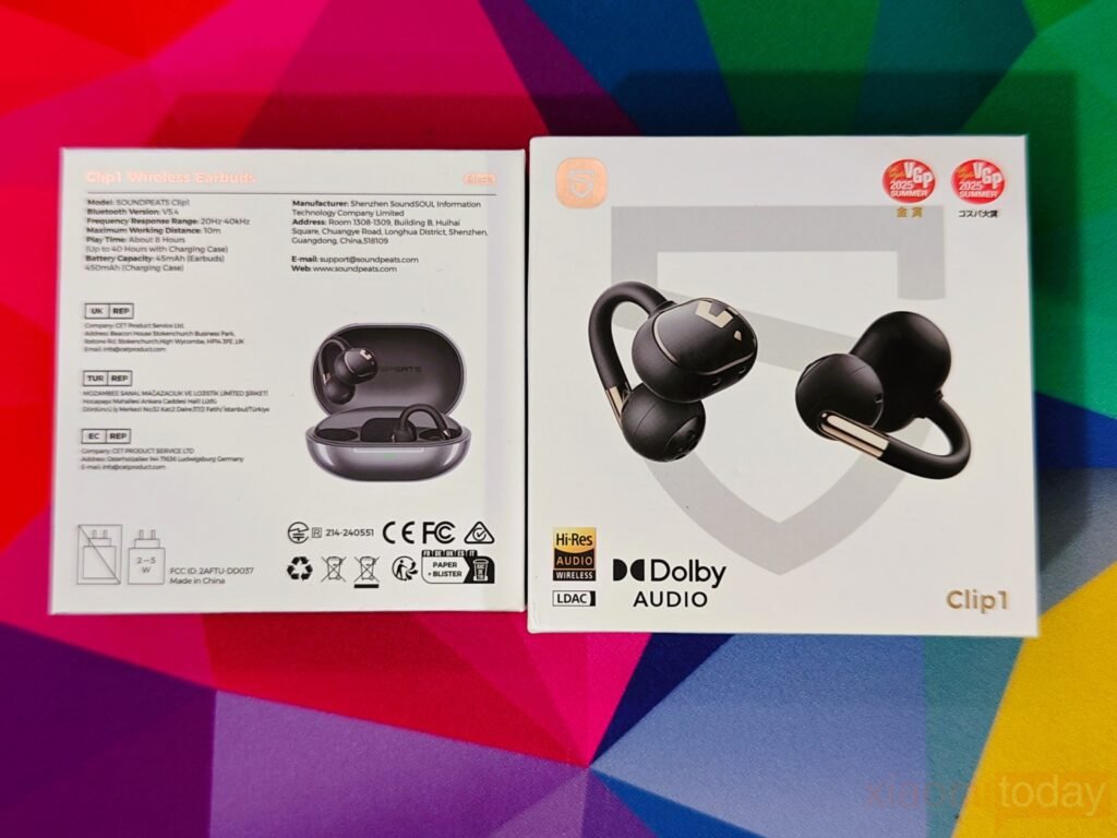 The SOUNDPEATS Clip1 comes in a clean, premium-looking box that highlights the earbuds’ elegant black and gold design. The front features key highlights like Hi-Res Audio Wireless, LDAC, and Dolby Audio support, along with VGP 2025 Summer Gold Award badges that emphasize its audio quality. On the back, detailed specifications are listed, including Bluetooth 5.4, a 20Hz–40kHz frequency range, 8 hours of playtime per charge (up to 40 hours with the case), and battery capacities of 45mAh for each earbud and 450mAh for the charging case. It also includes a product image showing the earbuds in their charging case.