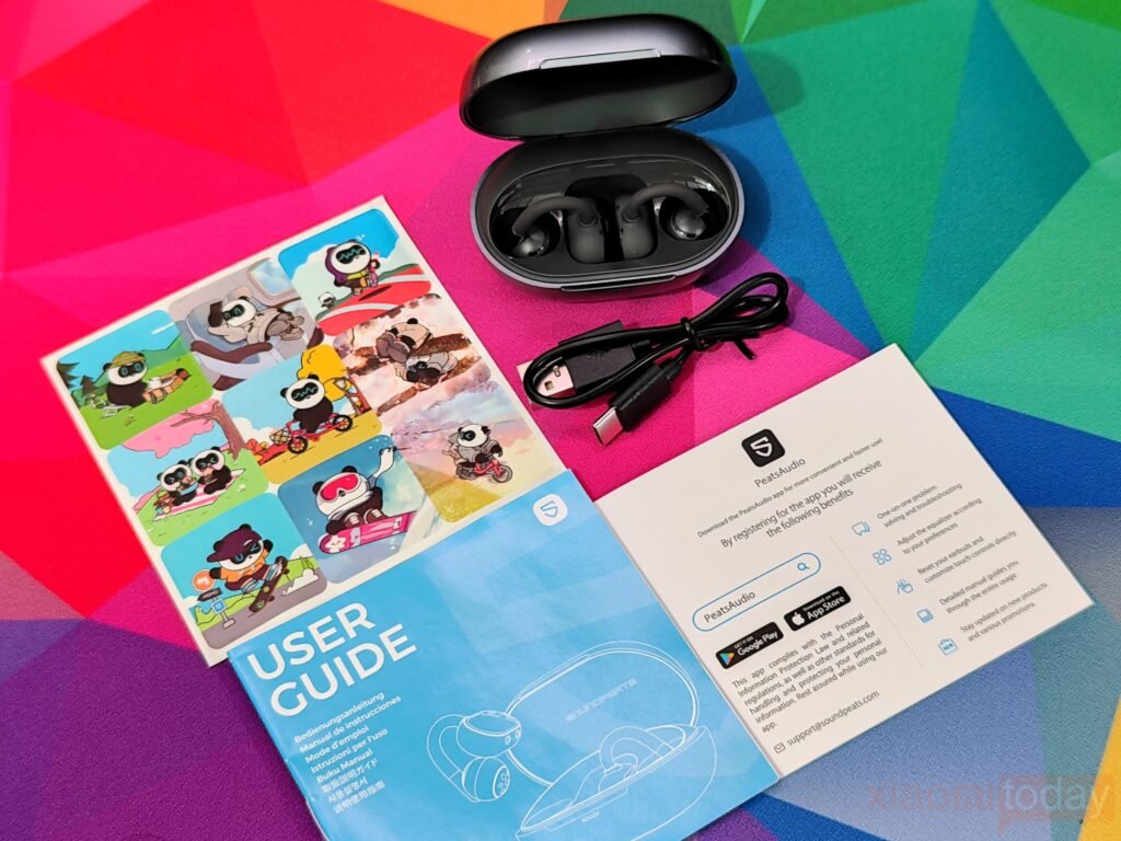 The SOUNDPEATS Clip1 unboxing is simple and organized. Inside, the earbuds are placed in their charging case, with a Type-C cable, a User Manual, an App Guide, and a few stickers included. Everything is neatly arranged, making it easy to start using the earbuds right away.