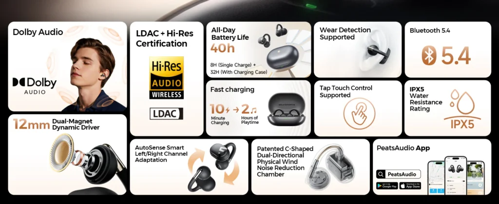 The SOUNDPEATS Clip1 delivers more than its open-ear design. Each earbud weighs about 5 grams and features the N-Flex Arch™ Memory Wire, providing a secure fit without pinching—even for glasses or helmet wearers. On the audio side, the earbuds support Hi-Res Audio with LDAC on Android, while the DynamicEQ™ Pro Algorithm balances bass and highs for a fuller sound. A 12mm dynamic driver and Dolby Audio support via the PeatsAudio app further improve music and video playback.