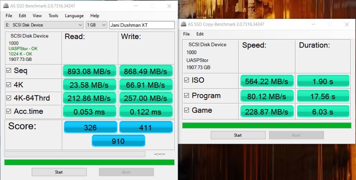 AS SSD testing confirms strong sequential performance, with reads of 893 MB/s and writes of 868 MB/s. Copy benchmarks show 564 MB/s for ISO files, while complex program transfers average 80 MB/s. The overall AS SSD score of 910 indicates reliable performance for general storage and gaming, though the access times suggest the drive is better suited for external storage rather than as a primary OS drive.