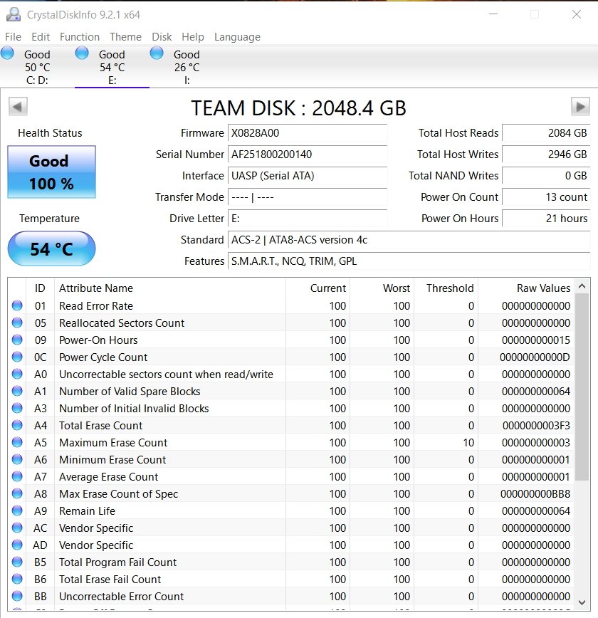 Out of the box, the drive offers 1.83TB of usable space from its 2TB capacity and comes preformatted in exFAT for seamless compatibility with Windows and macOS. CrystalDiskInfo identifies the device as “TEAM DISK: 2048.4 GB” and confirms support for S.M.A.R.T., NCQ, TRIM, and UASP, which helps maintain low latency and efficient command handling during sustained workloads.