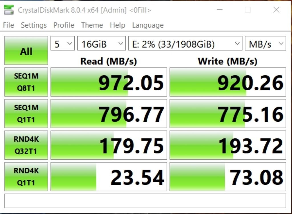 CrystalDiskMark testing shows sequential read speeds of 972 MB/s and write speeds of 920 MB/s. Random 4K Q32T1 performance reaches 179.75 MB/s reads and 193.72 MB/s writes, while 4K Q1T1 speeds, which reflect real-world responsiveness, measure 23.54 MB/s read and 73.08 MB/s write. These results highlight the drive’s ability to handle both large transfers and smaller, everyday tasks efficiently.