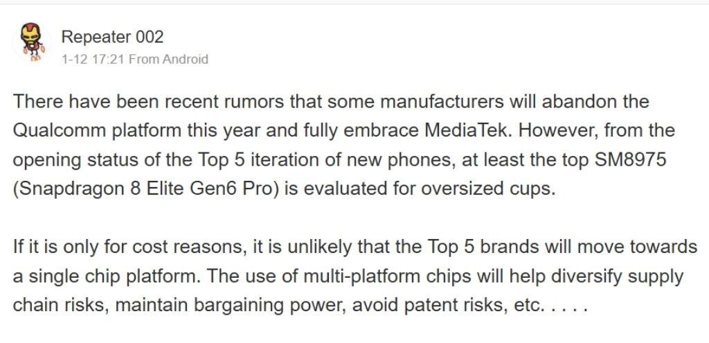 According to information shared by Weibo user Repeater 002, development plans from the world’s top five Android smartphone manufacturers still point toward the use of the Snapdragon 8 Elite Gen 6 Pro in their premium flagships. Another tipster, Smart Chip Insider, has also claimed that Qualcomm is planning a dual-chip strategy, where the Pro model is reserved for high-end devices, while the standard version is expected to ship in larger volumes across a wider range of phones.