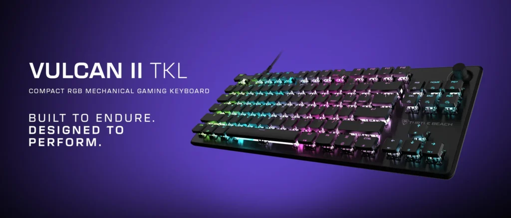 The Vulcan II TKL features a tenkeyless layout that allows more desk space for mouse movement, making it suitable for fast-paced games such as shooters and MOBAs. It uses Turtle Beach’s TITAN HS hot-swappable mechanical switches, which are pre-lubed for smoother operation and easier maintenance. The keyboard also includes sound-dampening foam and a brushed aluminium top plate for added durability. Each key supports per-key RGB lighting, customizable through the Swarm II app and synchronized using AIMO intelligent lighting. Gamers can save up to five onboard profiles, while features like ReacTap SOCD, anti-ghosting, and EASY-SHIFT[+] ensure reliable control and extended functionality.