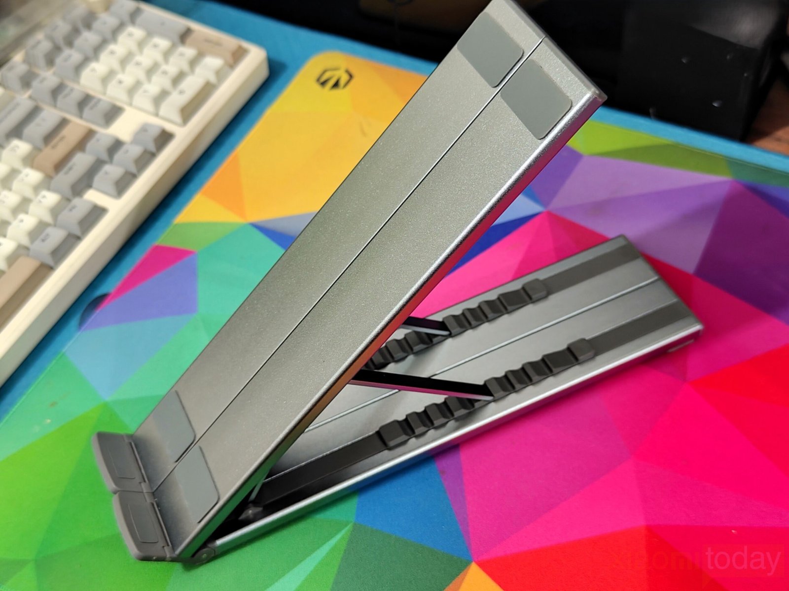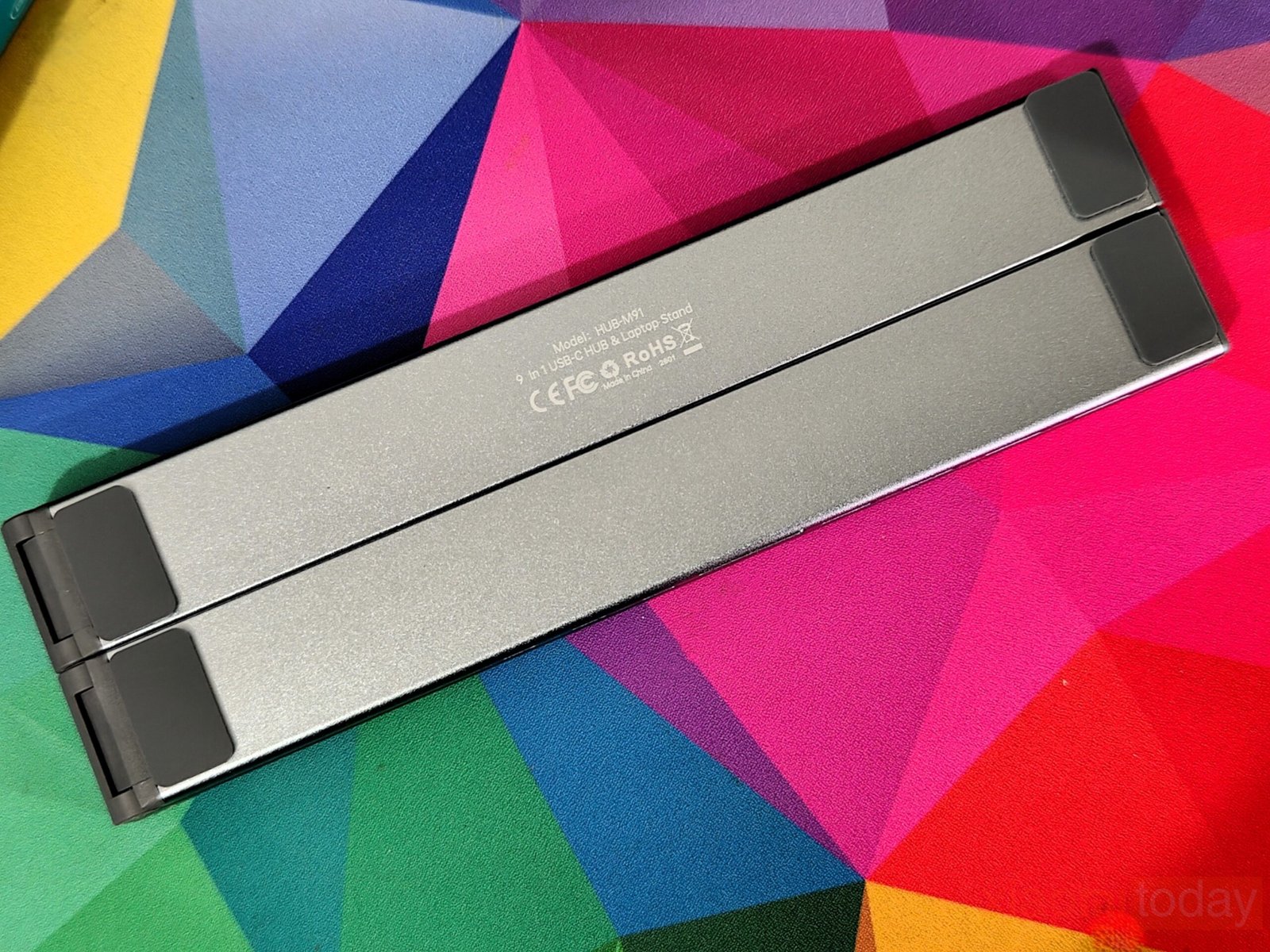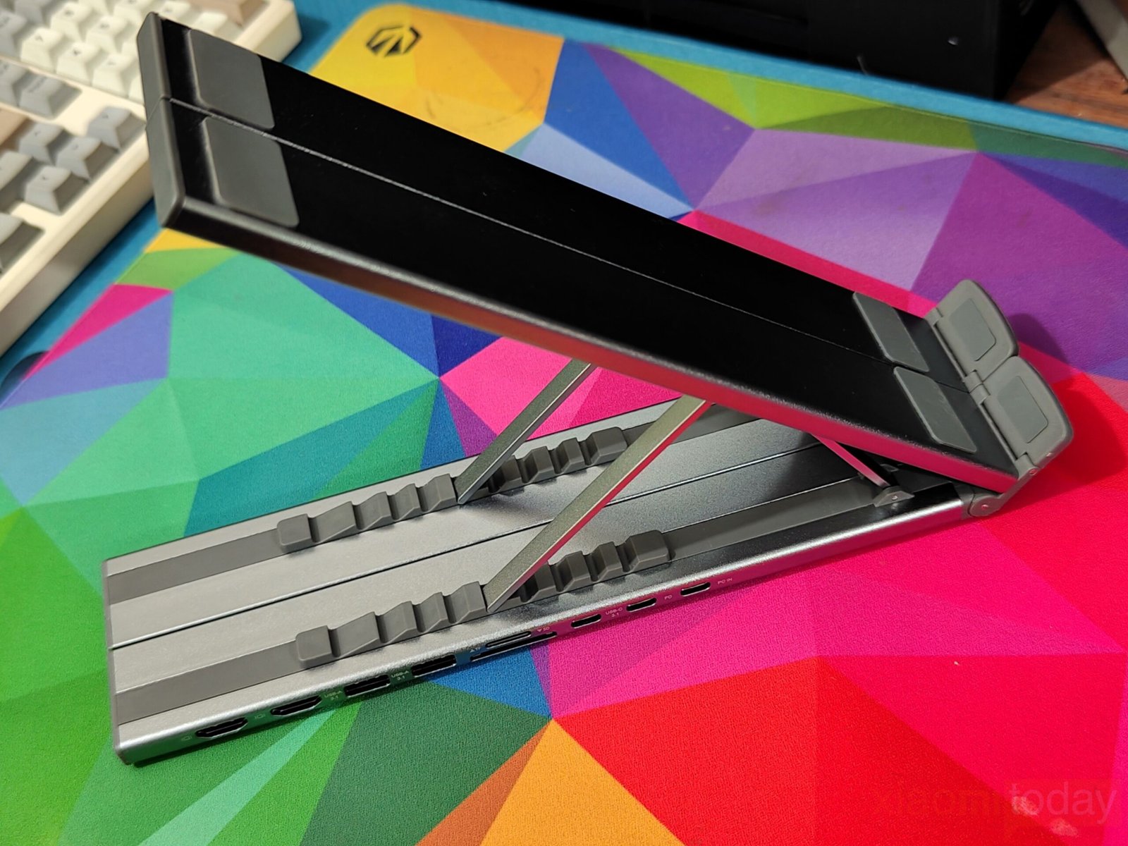 Alongside port expansion, the built-in stand provides nine adjustable height levels, allowing users to position their laptop at a more comfortable viewing angle. The aluminum construction adds rigidity while maintaining a lightweight, foldable form factor designed for mobile setups. The open structure also helps improve airflow compared to placing a laptop flat on a desk.