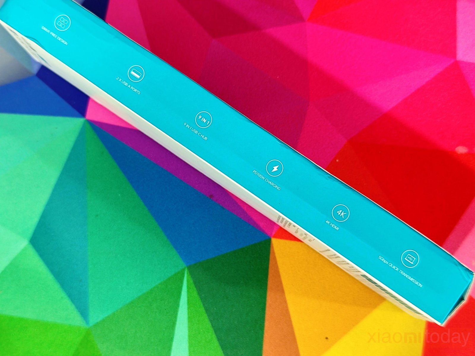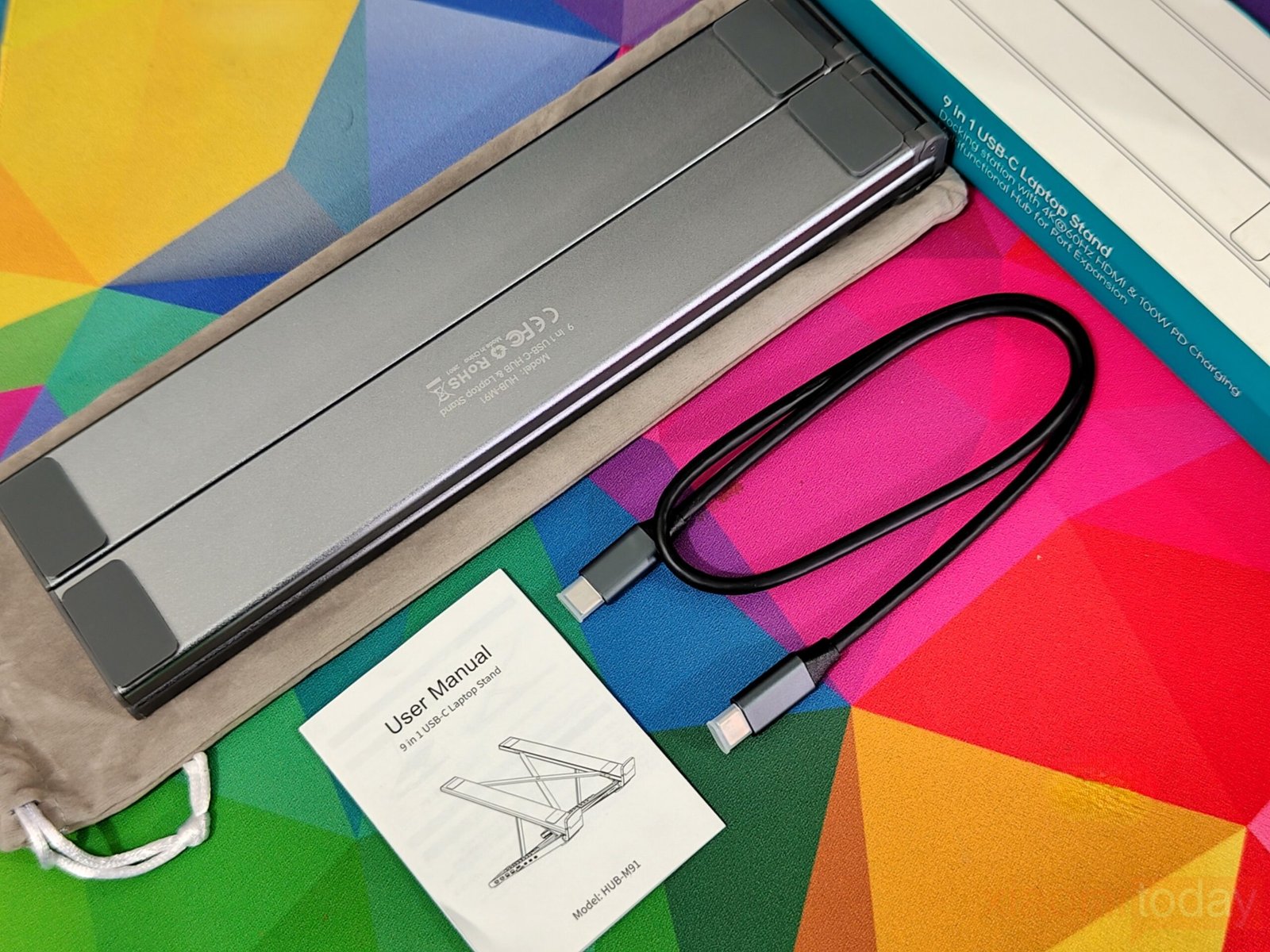 Inside the box, the USB-C Laptop Docking Station Stand (9-in-1) is presented neatly and practically. The hub itself is wrapped in a soft fabric sleeve that protects it from scratches during shipping. A USB-C to USB-C cable is included for connecting the dock to a laptop, with a solid build and good thickness. A small user manual provides basic setup instructions and a clear overview of the ports. While there are no extra accessories, everything required to start using the hub is included, making the unboxing simple and efficient.