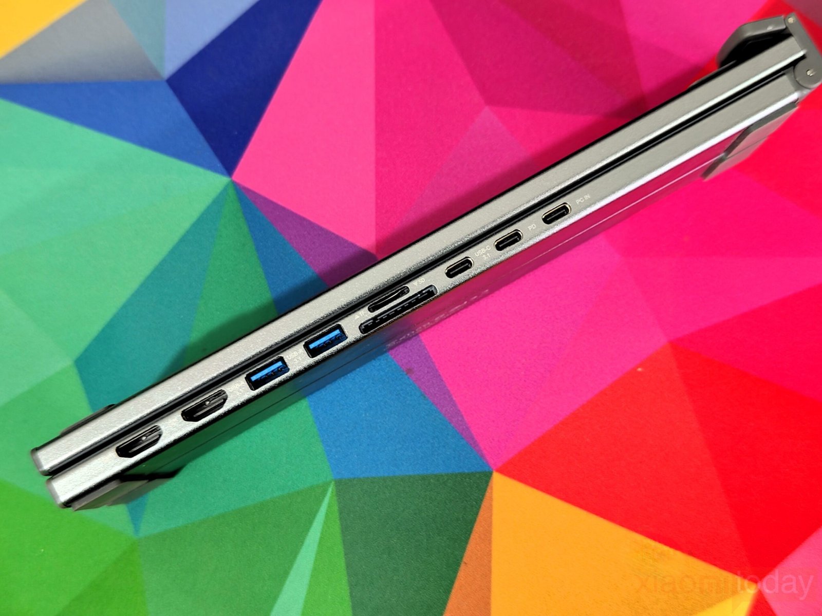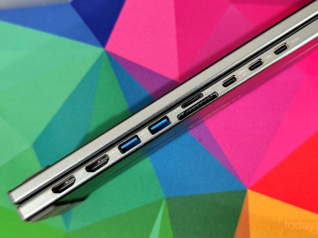 On the connectivity side, the integrated USB-C hub is built directly into the base. The port selection includes HDMI with 4K output, two USB-A ports rated at 5Gbps, a USB-C data port, USB-C power delivery input up to 100W, and SD and TF card slots. The ports are spaced well enough to avoid crowding, and having everything on one side helps keep cables organized.