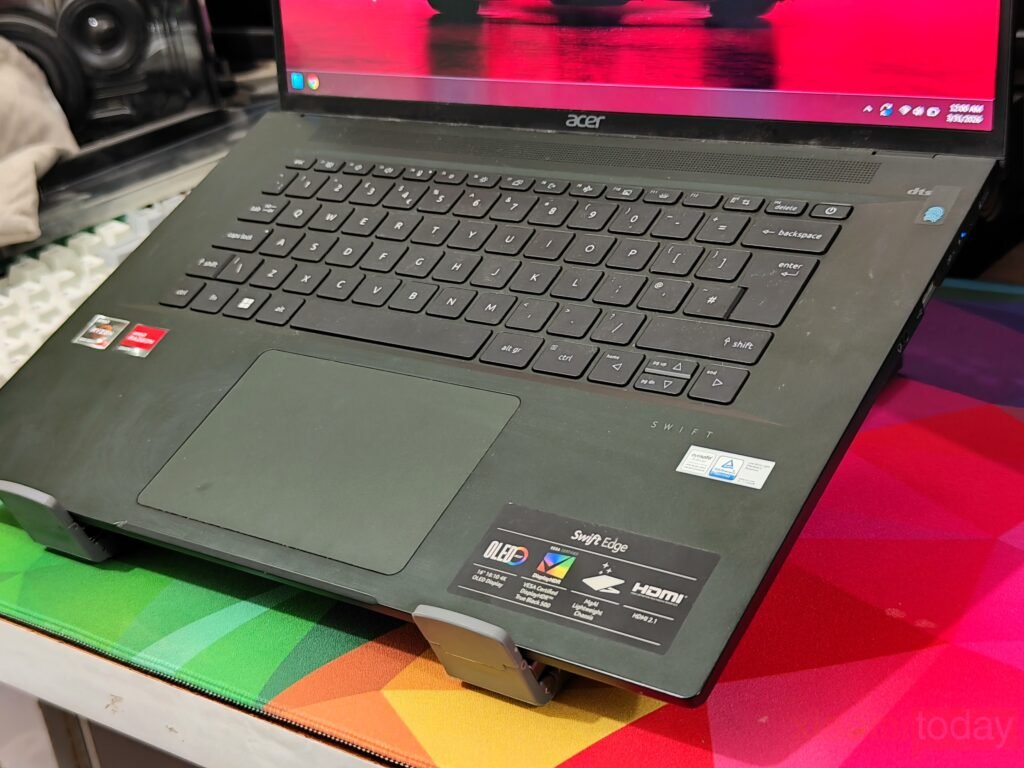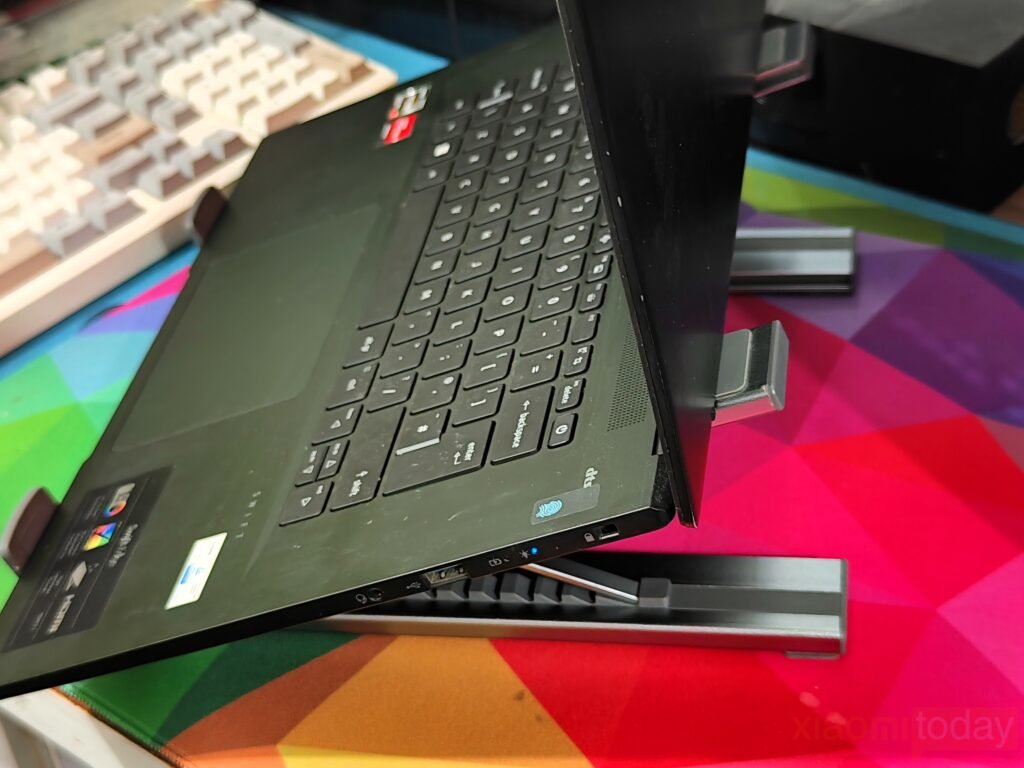 The adjustable stand plays an important role in everyday comfort. With nine height levels available, the laptop can be positioned at a more natural viewing angle compared to a flat desk setup. The hinge mechanism holds its position well once adjusted, providing enough resistance to prevent the laptop from shifting during typing. For longer sessions, raising the screen closer to eye level can help maintain a more balanced posture, particularly when used together with an external keyboard and mouse.