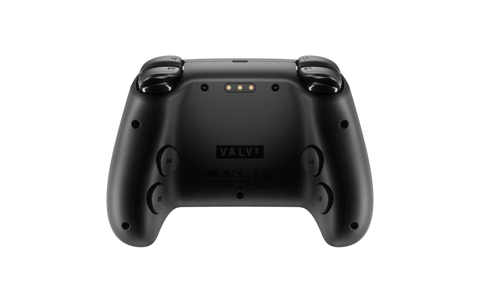 The controller features magnetic TMR thumbsticks, capacitive grips, pressure-sensitive trackpads, a 6-axis IMU, four programmable grip buttons, and four haptic motors for detailed feedback. It is compatible with Windows, Mac, Linux, handheld devices, phones via Steam Link, and all Steam hardware.