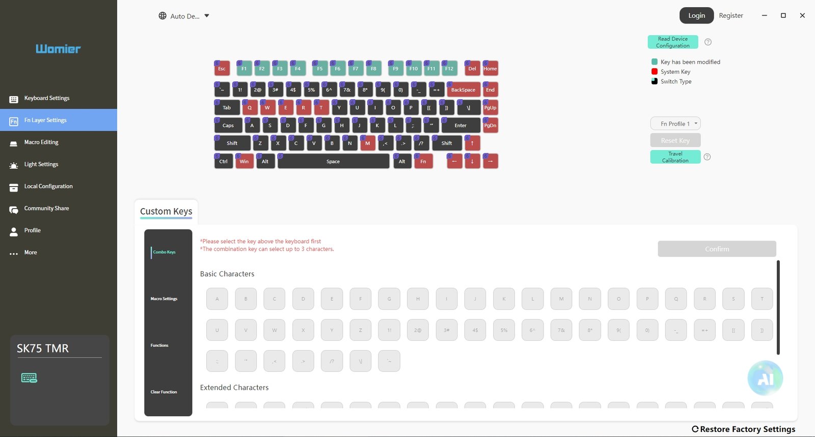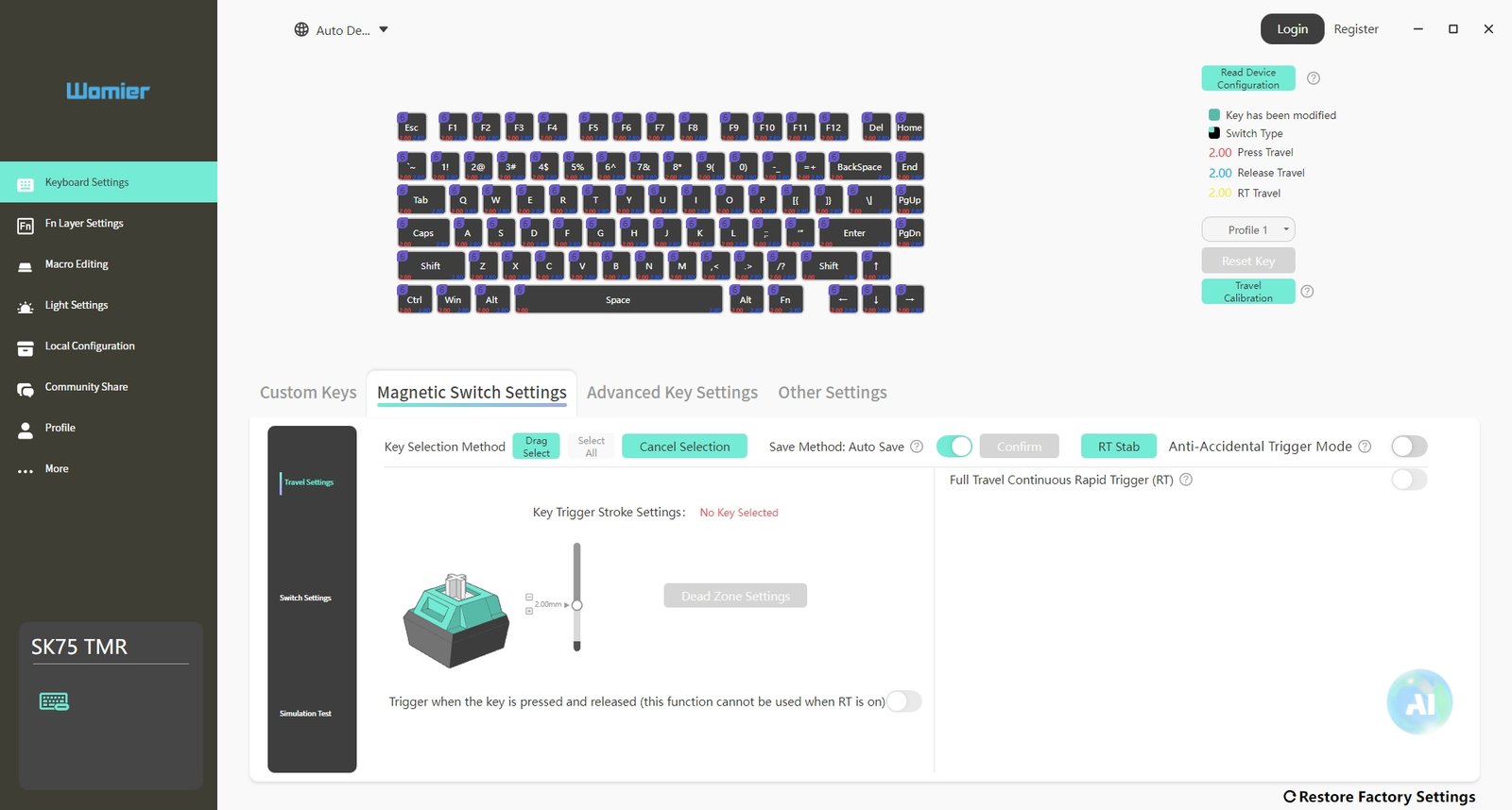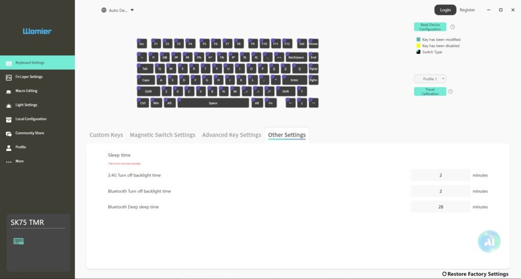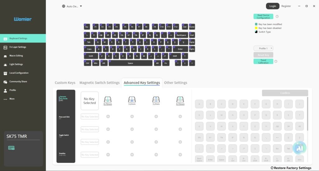 The WOMIER software included with the SK75 TMR keeps the experience focused and easy to manage. The main interface presents a full keyboard layout, allowing quick access to individual keys for adjustments. Selecting and modifying keys feels responsive, and changes apply immediately without requiring a reconnect or profile reload. The layout is clean enough that most users can get familiar with it in a short time.