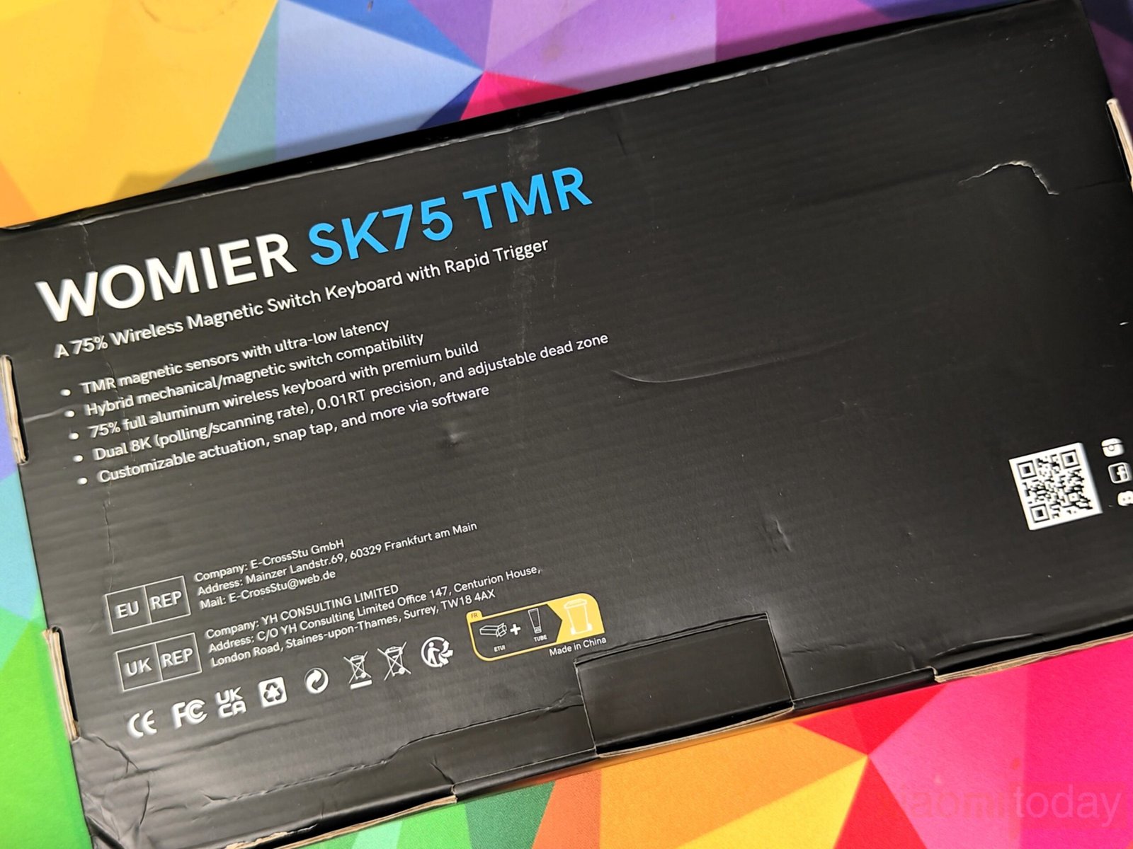 The Womier SK75 TMR comes in a compact black box with a minimal design. The front highlights the keyboard layout and model name, while the back lists key features like TMR magnetic sensors, rapid trigger support, and wireless connectivity.