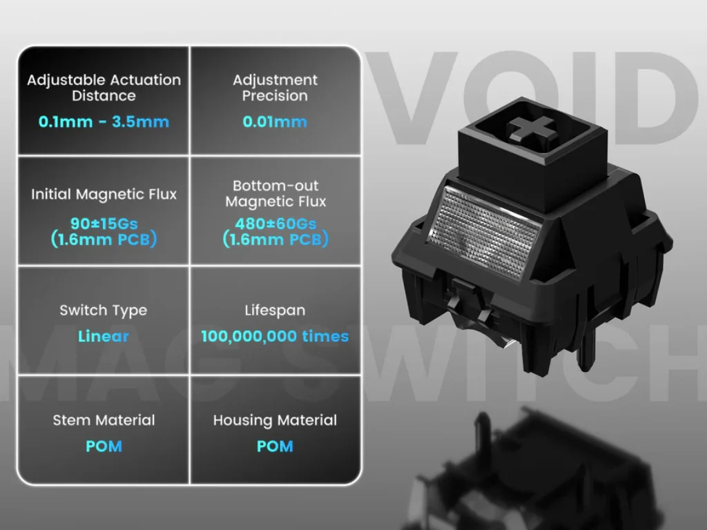 In terms of performance, the switches work alongside the TMR sensor system, allowing actuation points to be adjusted through software. Changes apply quickly, making it easy to fine-tune input response based on preference. The use of a standard MX stem ensures compatibility with a wide range of keycaps, while the internal construction supports durability with a lifespan rated at around 100 million keystrokes. With a total travel of 3.4 ± 0.2 mm, the overall feel remains familiar, while still offering the added control that comes with magnetic switch tuning.