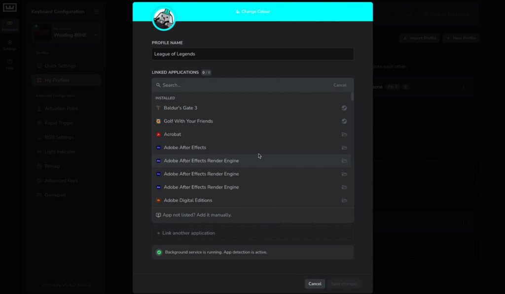 The feature works through the Wootility Background Service and supports linking up to eight applications per profile. On supported keyboards like the Wooting 80HE and Wooting 60HE V2, users can store up to four onboard profiles. This setup allows profiles to remain accessible even without the software running in the foreground.