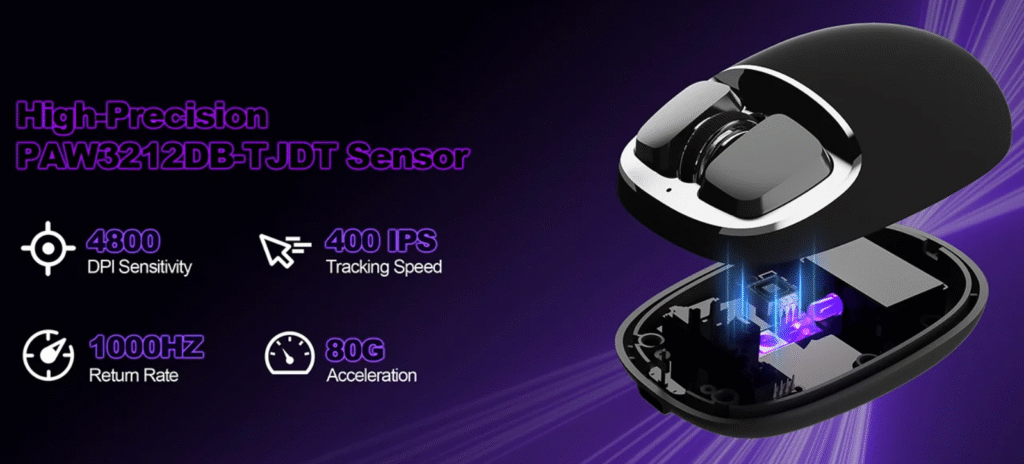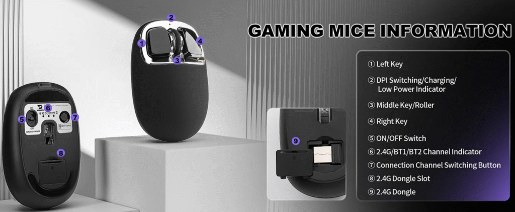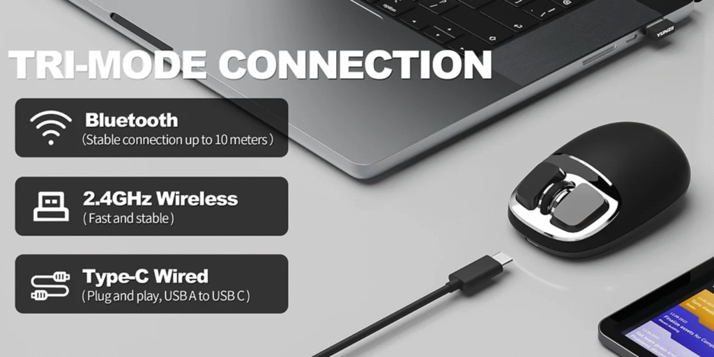 The C1 offers a flexible tri-mode connectivity setup that lets users move between Bluetooth, 2.4 GHz wireless through the included USB receiver, and a USB-C wired link. This versatility makes it easy to use the mouse across multiple devices with minimal disruption, whether paired with a laptop, desktop, tablet, or smartphone. Compatibility spans Windows, macOS, Android, and iOS, allowing it to fit smoothly into mixed-device routines.