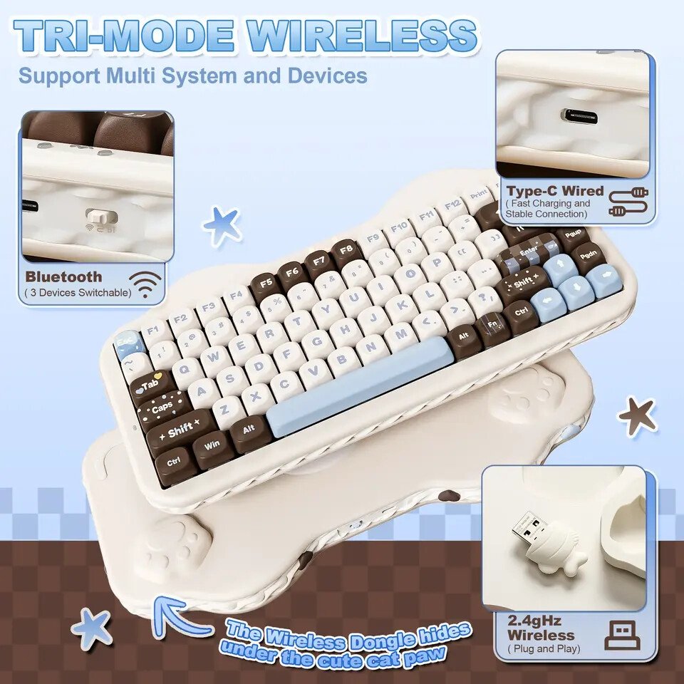 Tri-mode connectivity allows the C75 to operate through Bluetooth 5.0, 2.4 GHz wireless, or a wired USB Type-C connection. The keyboard supports pairing with up to five devices, enabling users to switch between systems such as desktops, laptops, tablets, and smartphones. Compatibility includes Windows, macOS, Android, and iOS platforms, providing flexibility for both work and general use. Wireless performance focuses on maintaining stable input with low latency, which can be useful for both office tasks and gaming scenarios.