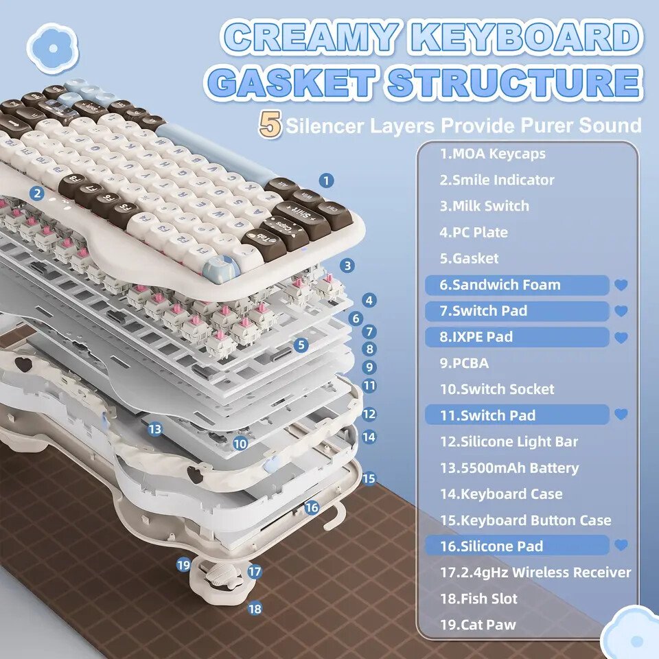 The keyboard uses a gasket-mounted internal structure designed to deliver a softer typing response. Multiple layers of sound-dampening materials are integrated inside the case to reduce unwanted noise and vibration. Pre-lubed switches and tuned stabilizers contribute to a consistent keypress feel, while silicone padding helps produce a deeper typing sound profile often preferred by users who favor quieter mechanical keyboards. This construction approach has become increasingly common among compact custom-style keyboards, offering improved comfort during long typing sessions.