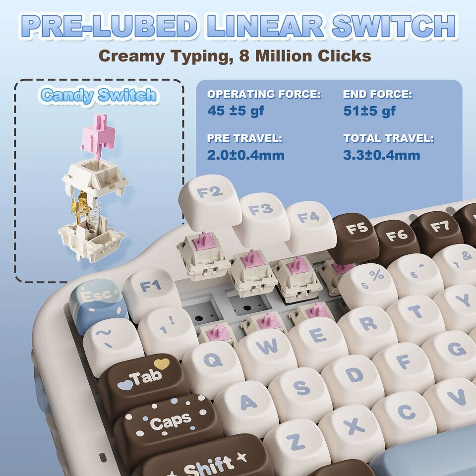 Customization remains a key part of the package through a hot-swappable PCB that supports both 3-pin and 5-pin mechanical switches. This allows users to replace switches without soldering, making it easier to adjust typing feel over time. The keyboard is available with pre-lubed linear switch options, including the YUNZII Candy Linear Switch and the YUNZII Milk V2 Linear Switch, both designed to provide smooth keystrokes with balanced actuation force and travel distance.